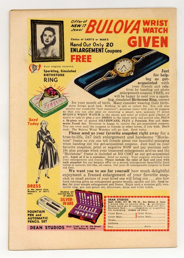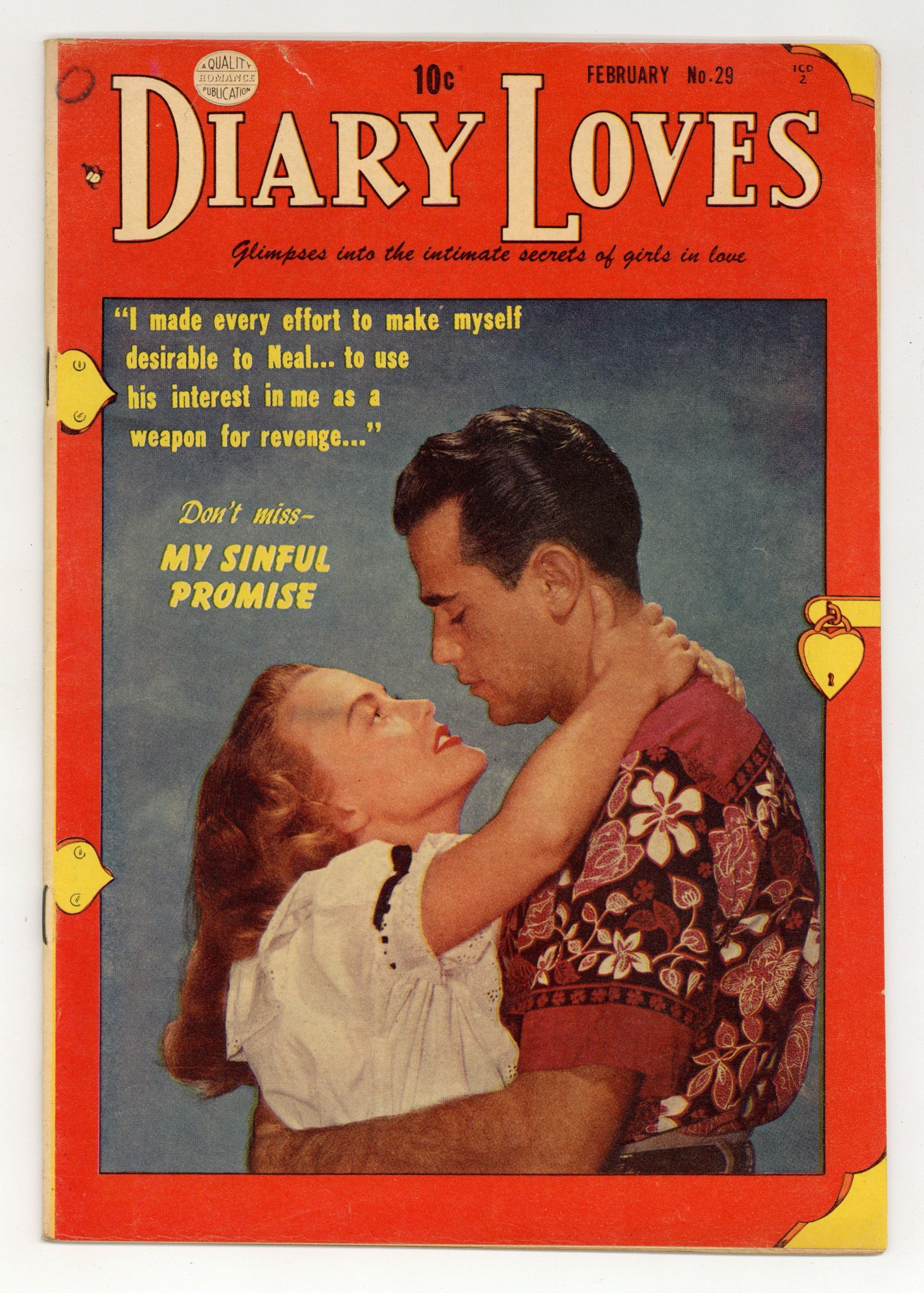 $40.00Photo Cover. Stories by unknown. Art by Ogden Whitney, Leo Morey and unknown. Featuring: "For Better or Worse" starring Beth, John, Roger Wilder and Wendy Stanton; "This Time It's for Keeps" starring Arlene Dyer, Bert, Jerry Goodson, Judy, Lynne, Mrs. Goodson and Tommy Chapman; "West Point Romance" starring Doc Stoddard, Gwen Stoddard, Paula Phillips and Stan Middleton; and "My Sinful Promise" starring Charlene Fellows, Mrs. Fellows, Neal Crandall, Pam and Roger Crandall. Plus: 1-page text story "He's Right for Me" starring Alice Miller, Dan Little and Greg Walters. 32 pages, full color. Cover price $0.10.