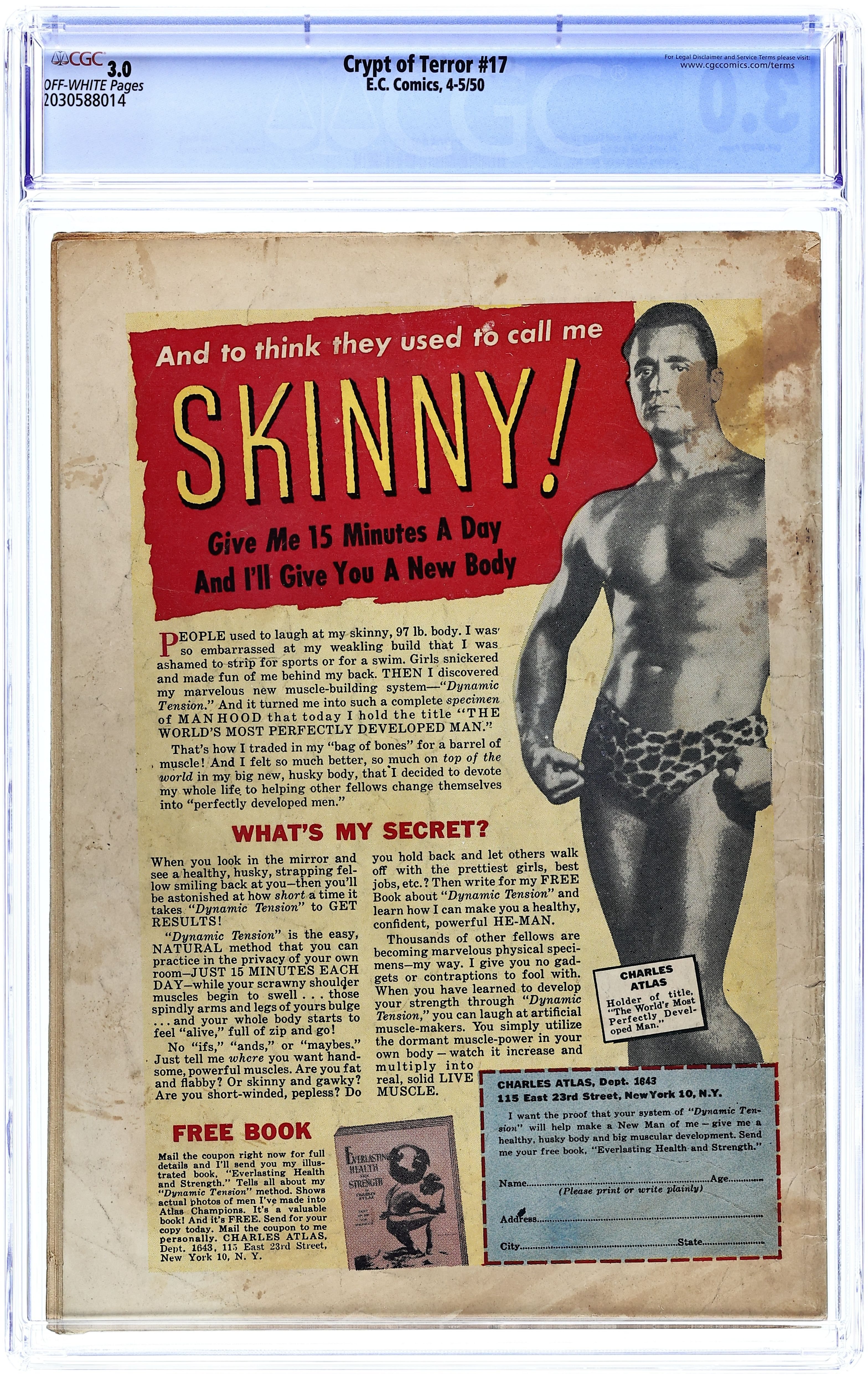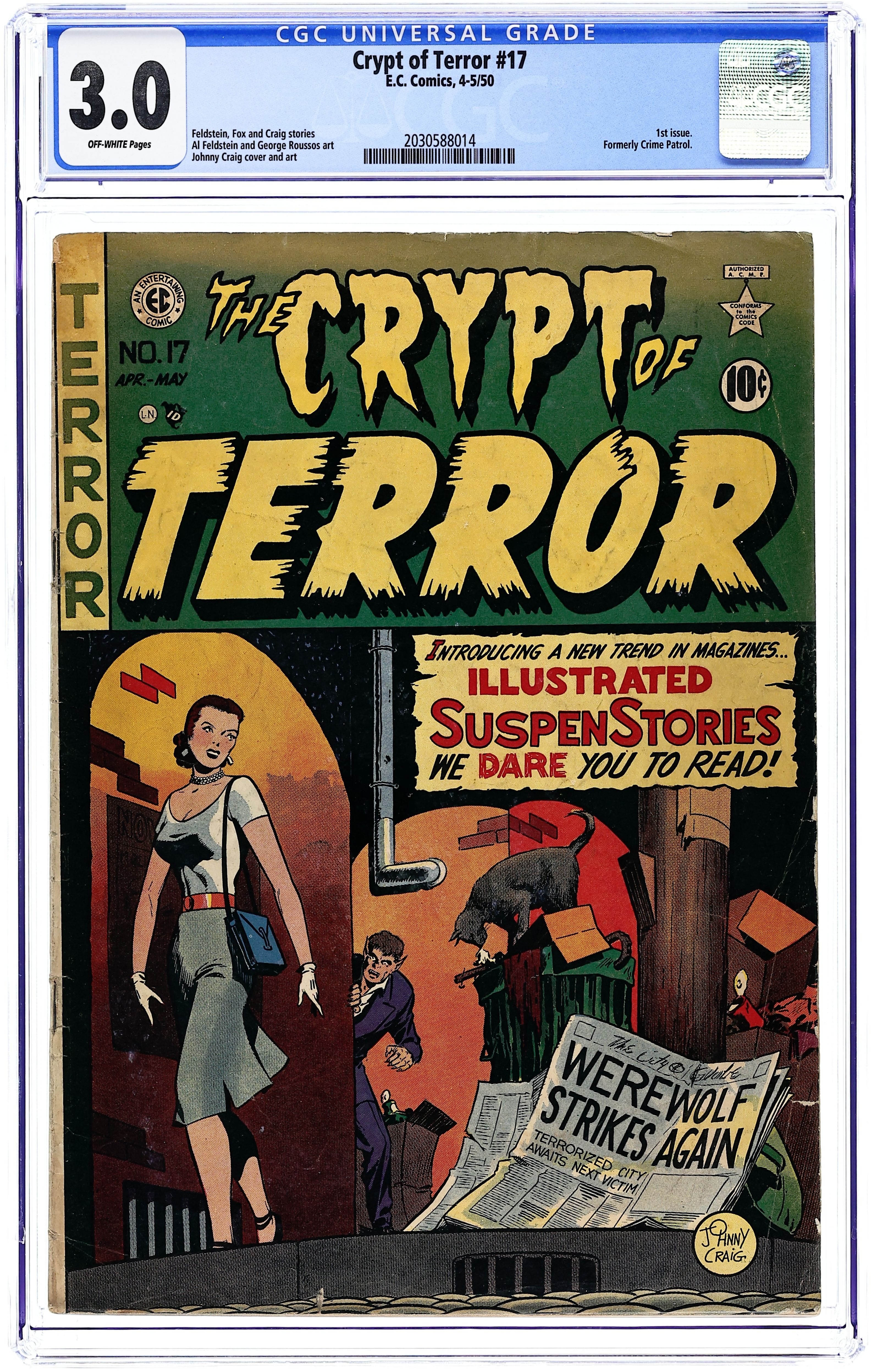 Cover art by Johnny Craig, his first EC Horror work. First of the "New Trend" issues to hit the stands, this is the first issue of Crypt of Terror with numbering continuing from Crime Patrol (1948-1950 EC). Death Must Come, script and art by Al Feldstein; A transferred gland preserves youth. The Man Who Was Death, script by Gardner Fox, art by Bill Fraccio; A state executioner takes the law into his own hands. The Corpse Nobody Knew, script by Al Feldstein, art by George Roussos; A couple find a body in their hotel room and play detective. Curse of the Full Moon!, script and art by Johnny Craig; Ralf thinks he's become a werewolf after being scratched by a Wolfsbane plant. 36 pgs. $0.10. Cover price $0.10.
