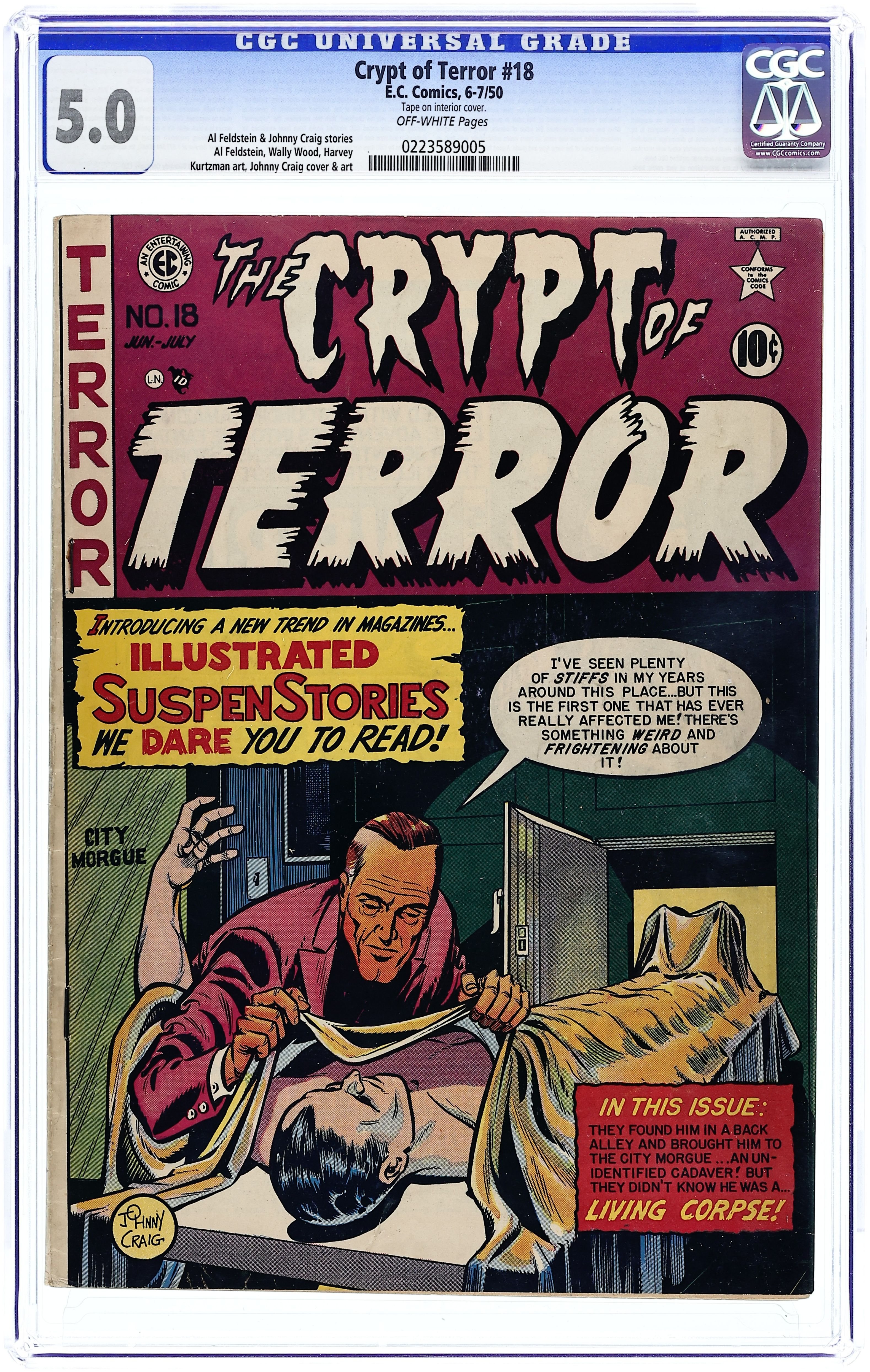 Cover art by Johnny Craig. The Maestro's Hand, script and art by Al Feldstein; Dr. Hellman arrives at a cabin in the woods to forget the suicide of his ex-fiancee after he unnecessarily removed the injured piano hand of her lover and he killed himself. The Living Corpse, script by Al Feldstein, art by Wally Wood; A magician strikes his assistant while wearing a snake ring and then attempts to locate where her body was taken by playing dead himself as to remove the snake imprint evidence. Madness At Manderville, art by Harvey Kurtzman; When Tom Mander and his wife lose their son Billy, Tom worries the strain may be driving her insane when she tells him that she sees and hears things he cannot. Mute Witness To Murder!, art by Johnny Craig. 36 pgs. $0.10. Cover price $0.10.