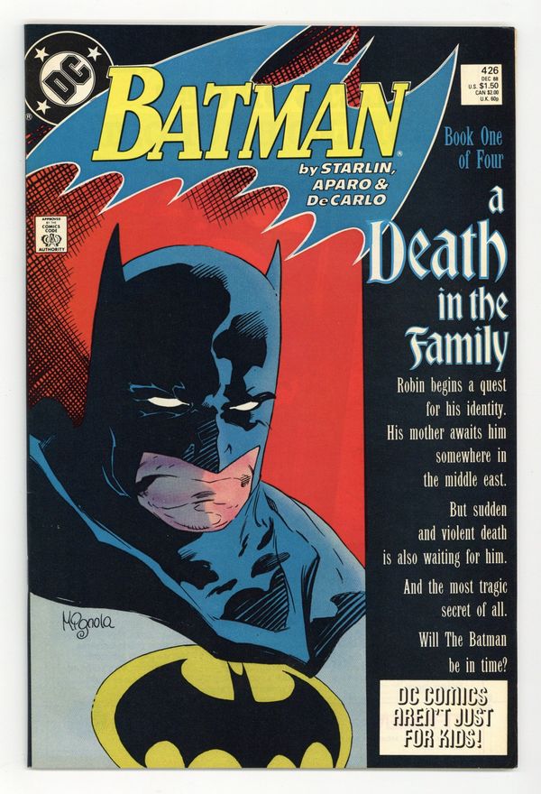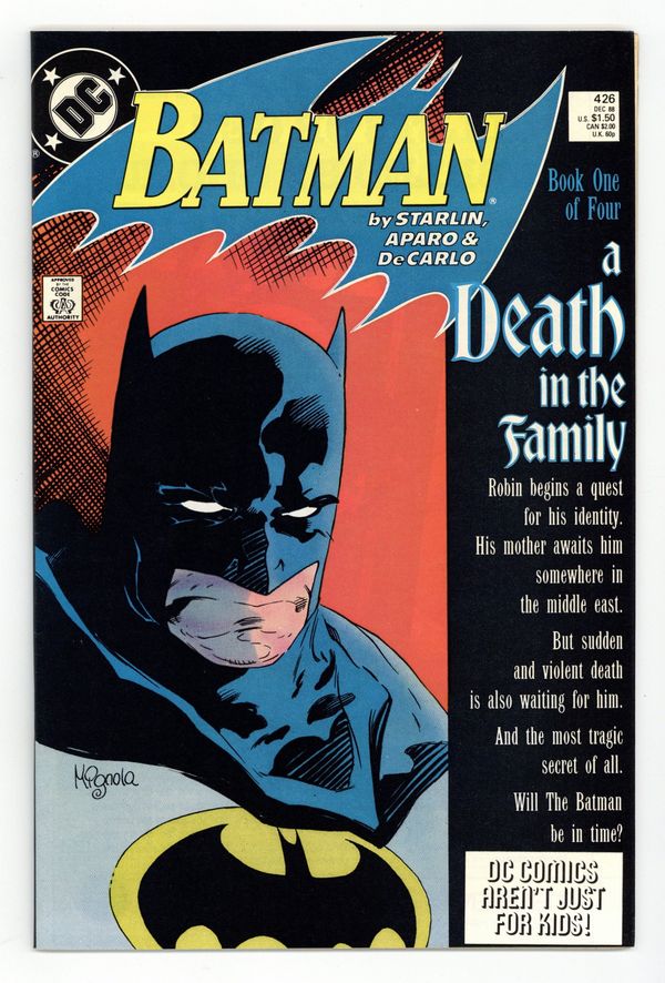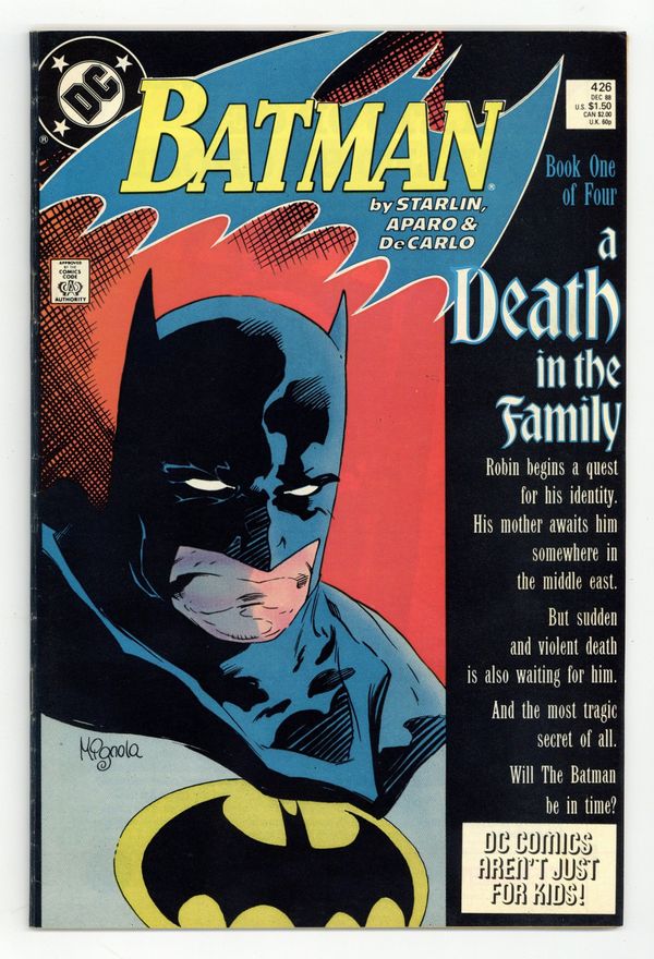 First printing. Direct Edition. Cover art by Mike Mignola. "A Death in the Family" part 1 of 4, script by Jim Starlin, pencils by Jim Aparo, inks by Mike DeCarlo; Jason discovers that his "real" mother was really his step-mother, and his birth mother is still alive; Joker escapes from Arkham and Batman chases him to the Middle East where he runs across Jason looking for one of the women he thinks is his mom. Infamous story where readers called an 800 number, and 'voted' to have Robin killed! Story continues in Batman #427. NOTE: Most issues from 397-432 were reprinted in 1989 and sold in multipacks. These 2nd and 3rd prints have back cover ads dated 1989. 52 Pages, Full Color. Cover price $1.50.