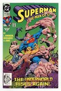 Not even Superman may be able to rescue the orphaned Keith, who's uncovered the amazing secret of the subterranean denizens of Metropolis's underworld. Also: Doomsday is coming...a first glimpse at a new character who will have a chilling effect on the life of Superman! Written by Louise Simonson, with art by Jon Bogdanove and Bob McLeod. Cover by Bogdanove and Dennis Janke. Cover price $1.25.
