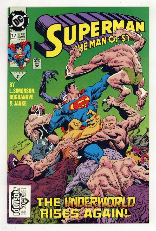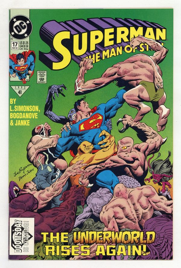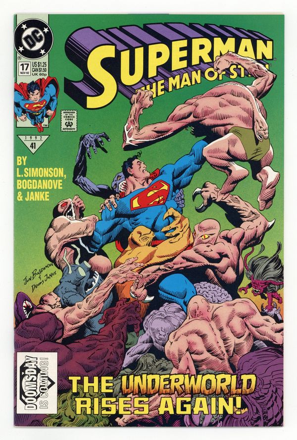 Tags: Superman 1992 Weekly Reading Order (part 41), Superman$23.00Not even Superman may be able to rescue the orphaned Keith, who's uncovered the amazing secret of the subterranean denizens of Metropolis's underworld. Also: Doomsday is coming...a first glimpse at a new character who will have a chilling effect on the life of Superman! Written by Louise Simonson, with art by Jon Bogdanove and Bob McLeod. Cover by Bogdanove and Dennis Janke. Cover price $1.25.