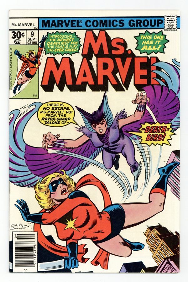 Tags: Marvel Legacy Numbering: Captain Marvel (part 9)$18.00Cover pencils by Dave Cockrum, inks by Joe Sinnott. Call Me Death-Bird!, script by Chris Claremont, pencils by Keith Pollard (breakdowns), Joe Sinnot (finished art), and Sam Grainger (finished art), inks by Joe Sinnott (pages 1, 3-6, 11) and Sam Grainger (pages 2, 7-10, 14-31); Deathbird tries to take down Ms. Marvel on orders from Modok; 1st appearance of Death-Bird. Including Death-Bird, Chris Claremont introduced a few characters in this series that would later become popular X-Men mainstays. Ms. Marvel's costume covers her stomach now. 36 pgs. $0.30. Cover price $0.30.