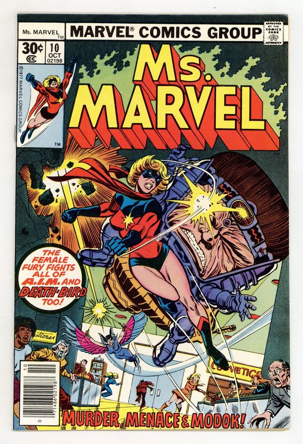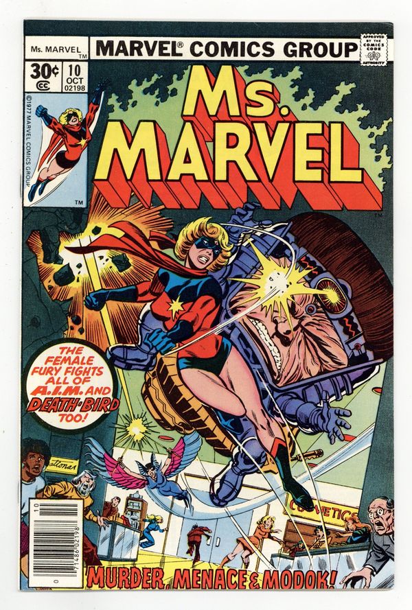 Last 30-cent issue. Cover pencils by Sal Buscema, inks by Tom Palmer. Cry Murder -- Cry Modok!, script by Chris Claremont, pencils by Sal Buscema (breakdowns) and Tom Palmer (finished art), inks by Tom Palmer; Ms. Marvel takes on Modok and Deathbird but both end up eluding her grasp. 36 pgs. $0.30. Cover price $0.30.