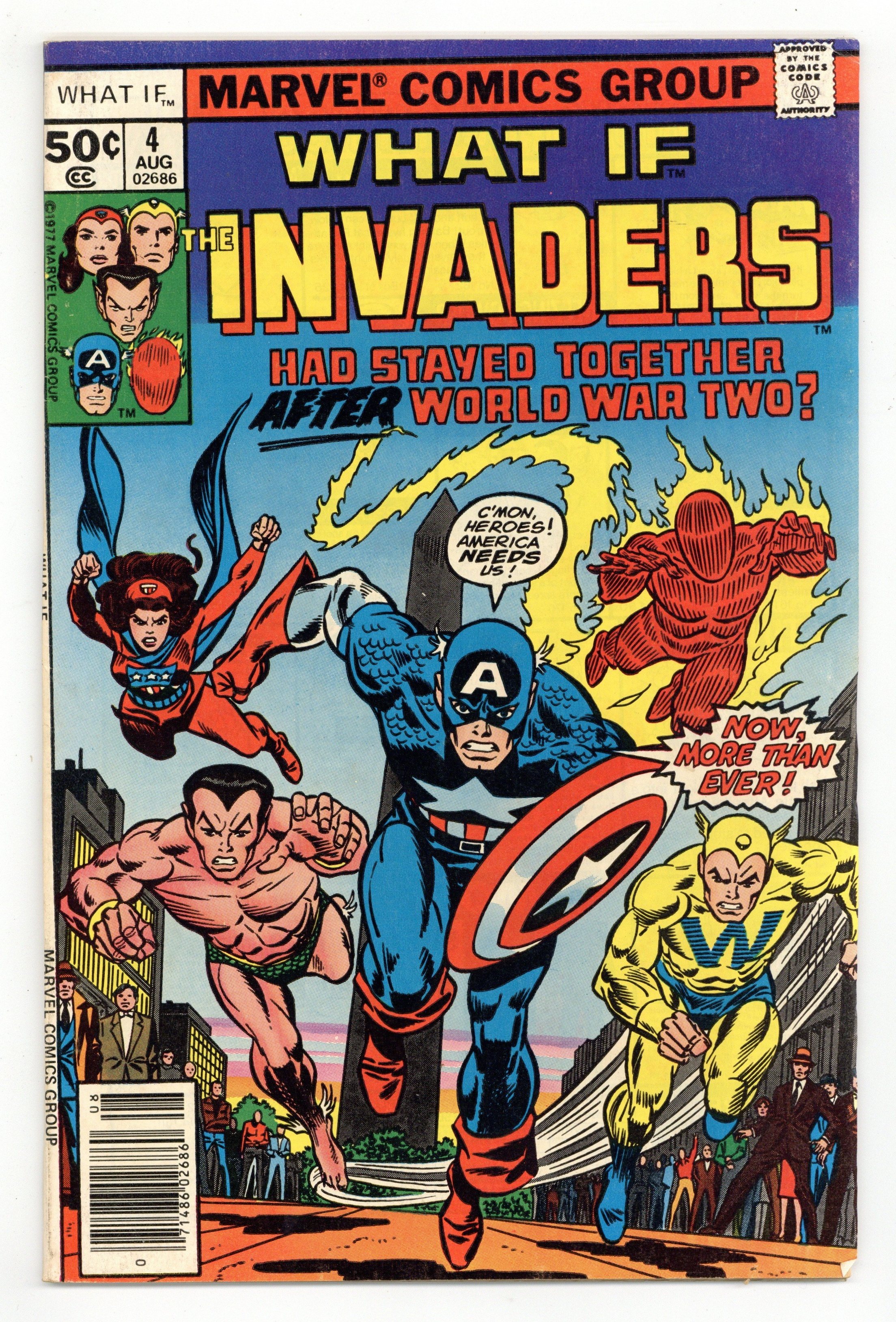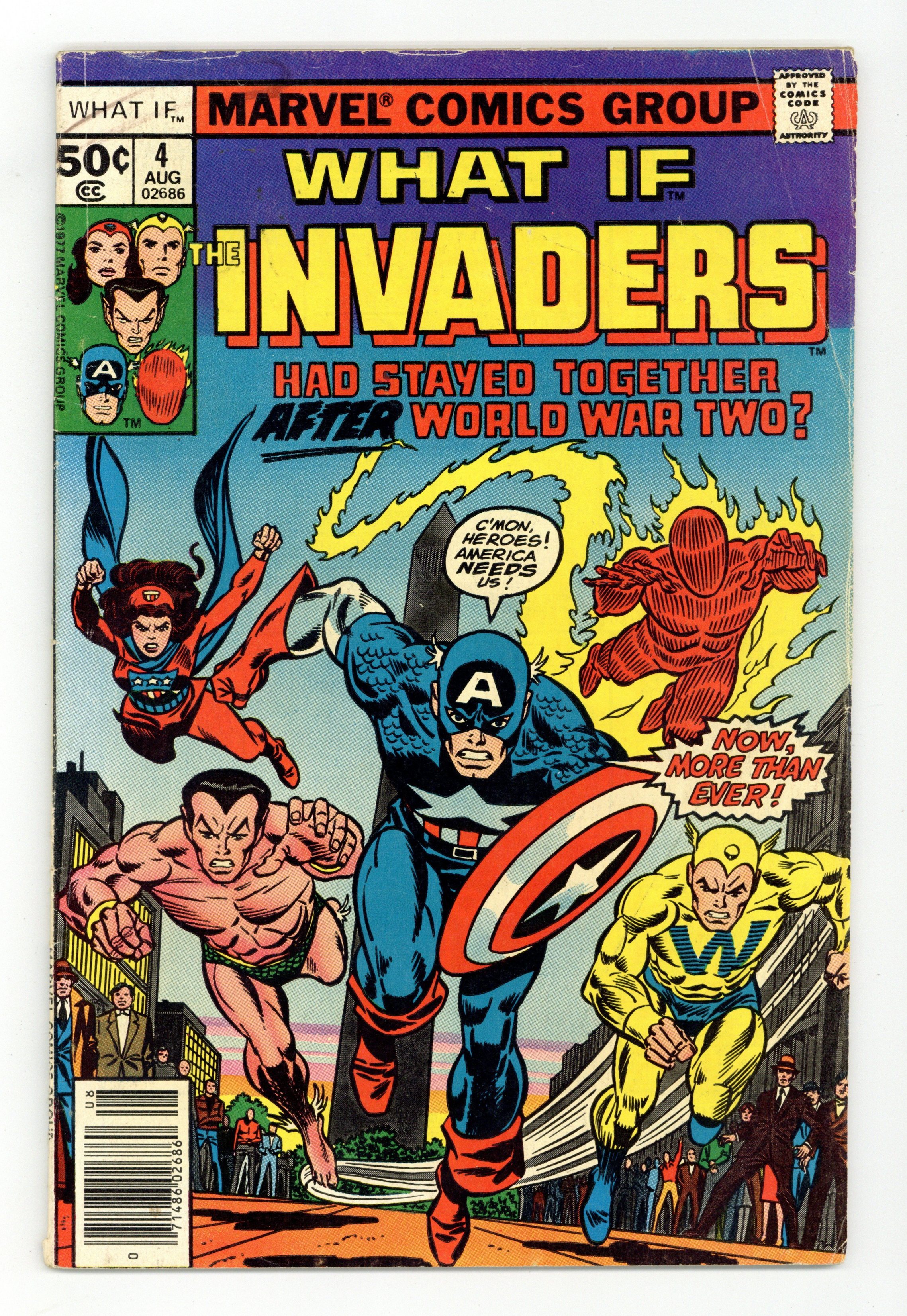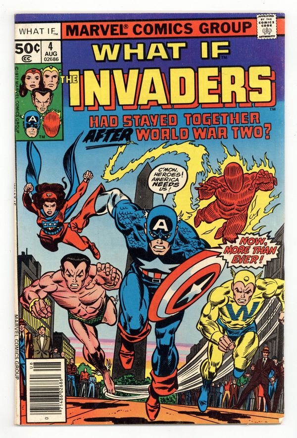 Cover pencils by Gil Kane, inks by Frank Giacoia. What if the Invaders Had Stayed Together After World War Two? starring the Invaders, script by Roy Thomas, pencils by Frank Robbins (breakdowns) and Frank Springer (finished art), inks by Frank Springer; This story is in continuity and explains the post-1945 Captain America; It features the death of the Spirit of '76 (Cap II) and the introduction of the Patriot as Capt III. Hostess Twinkie ad with Spider-Man, pencils by Ross Andru, inks by Mike Esposito. Article by Roy Thomas called Why Not? 52 pgs. Cover price $0.50.