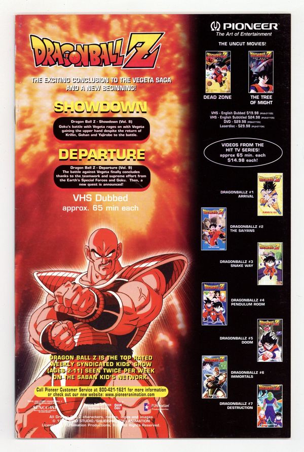 1st printing. Story and Art by Akira Toriyama. As seen on the hit animated TV series! Printed right to left like authentic Japanese manga! Young Goku has grown up, and his years of training have made him one of Earth's ultimate warriors, if not the ultimate warrior. But the stakes are increasing as ever deadlier threats appear, including a super-powerful race from outer space that lives for the thrill of combat. Now Goku and his friends must put their very lives on the line in the utmost test of martial arts skill! Dragon Ball Z is pure action adrenaline, with battles of literally earth-shaking proportions! 32 pages, B&W. Cover price $2.95.