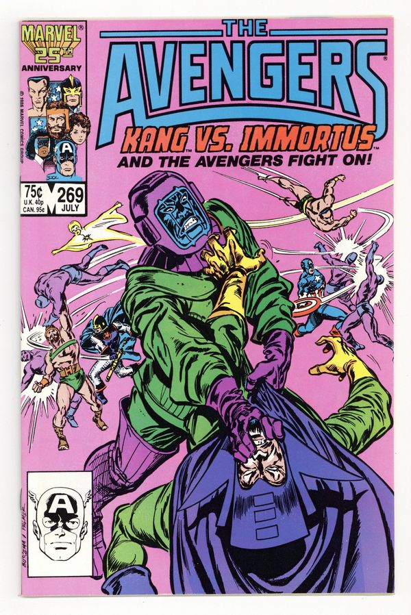 Tags: Marvel Legacy Numbering: Avengers (part 269), Avengers$16.00Direct Edition. "The Once and Future Kang!" Part 3 of 3. Script by Roger Stern. Art by John Buscema (breakdowns) and Tom Palmer (finishes). Cover by John Buscema and Tom Palmer. In timeless limbo Earth's Mightiest Heroes and their long-time foe, Kang the Conqueror, are captives of the chief council Kang! However, the Lion of Olympus cannot be held for long in a simple paralysis beam! When Hercules breaks free, chaos breaks loose! The Avengers assemble to battle the chief council Kang, while the 41st century Kang also attacks his Kang-brother! Confusing indeed! But in the land of limbo things are seldom what they seem. And eventually the true orchestrator of events is revealed! With Ravonna by his side, Immortus stops the fighting and makes everything all right. Or does he? The Avengers aren't so sure, but of course only time will tell. Flashback cameos by the Fantastic Four, Doctor Doom, and the Pharaoh Rama-Tut. Avengers Lineup: Black Knight, Captain America, Captain Marvel, Hercules, Sub-Mariner, and the Wasp. (Notes: Immortus appears next in Avengers West Coast 48. The significance of this three-part story was the return of Kang the Conqueror as a major villain for the Avengers. This issue sets the stage for many great future encounters.) 36 pages Cover price $0.75.