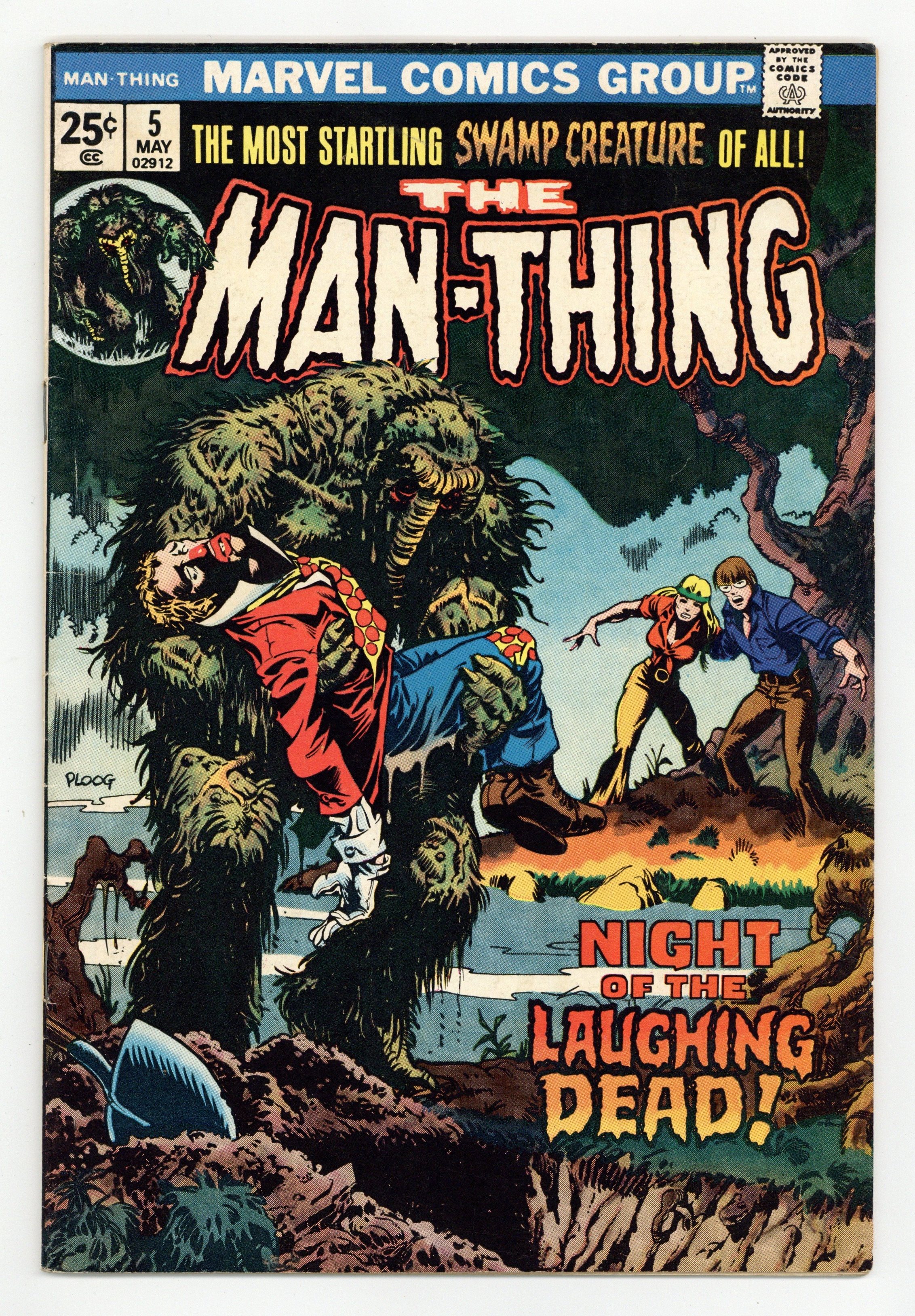 "Night of the Laughing Dead!" Written by Steve Gerber. Art by Mike Ploog and Frank Chiaramonte. The Man-Thing and his companions face the sinister assault of a spectral fiend. Includes Marvel Value Stamp. 32 pages, FC. Cover price $0.25.