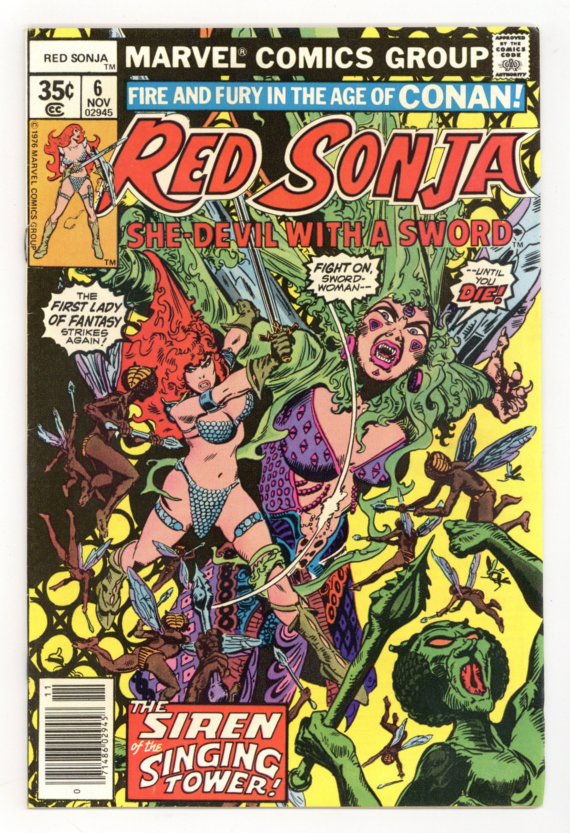 First 35-cent cover-price. "The Singing Tower." Script by Roy Thomas and Wendy Pini (of Elfquest fame), plot by Clara Noto, art and cover by Frank Thorne. Spider-Man stars in a one-page Hostess ad, "Legal Eagle." Cover price $0.35.