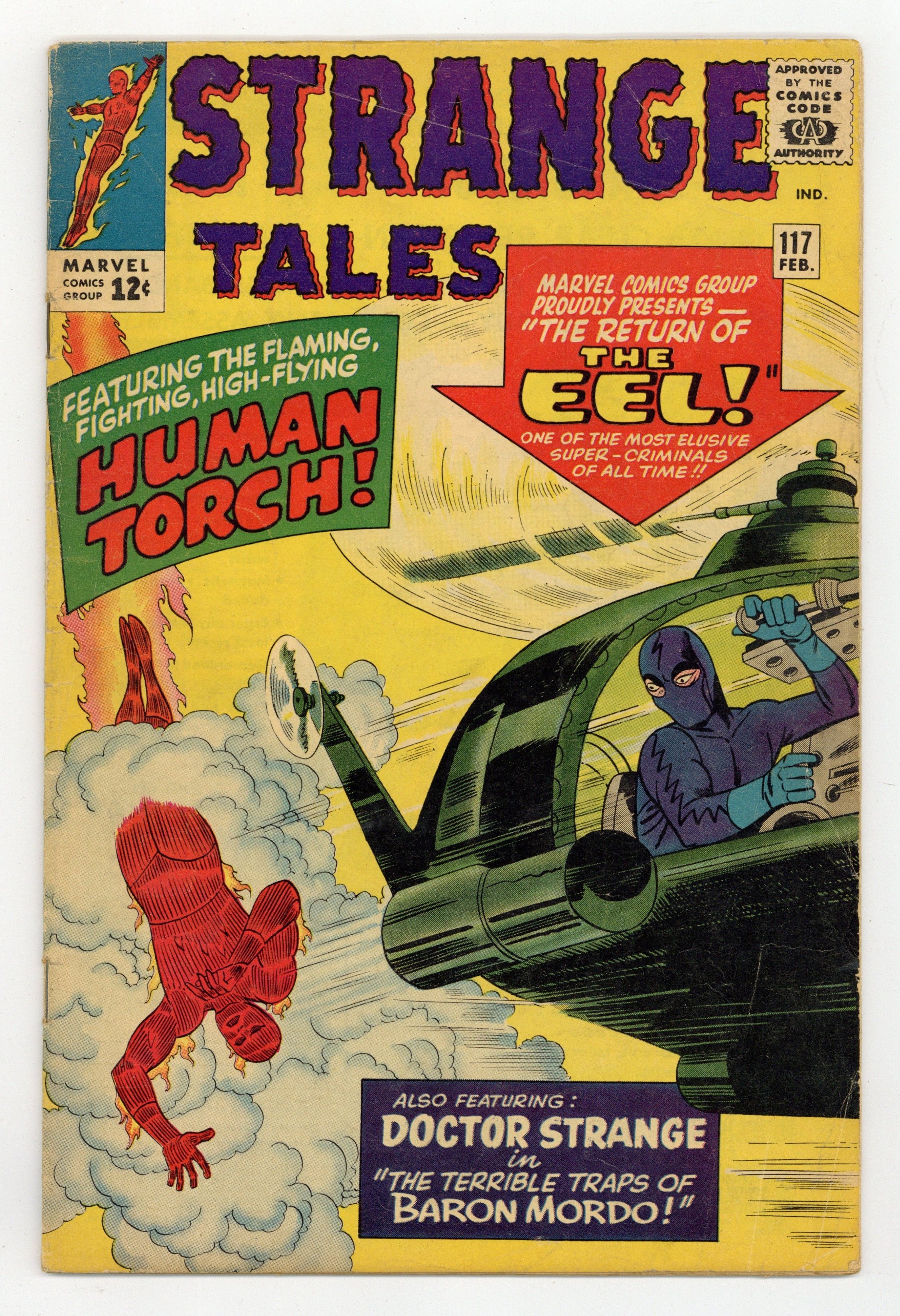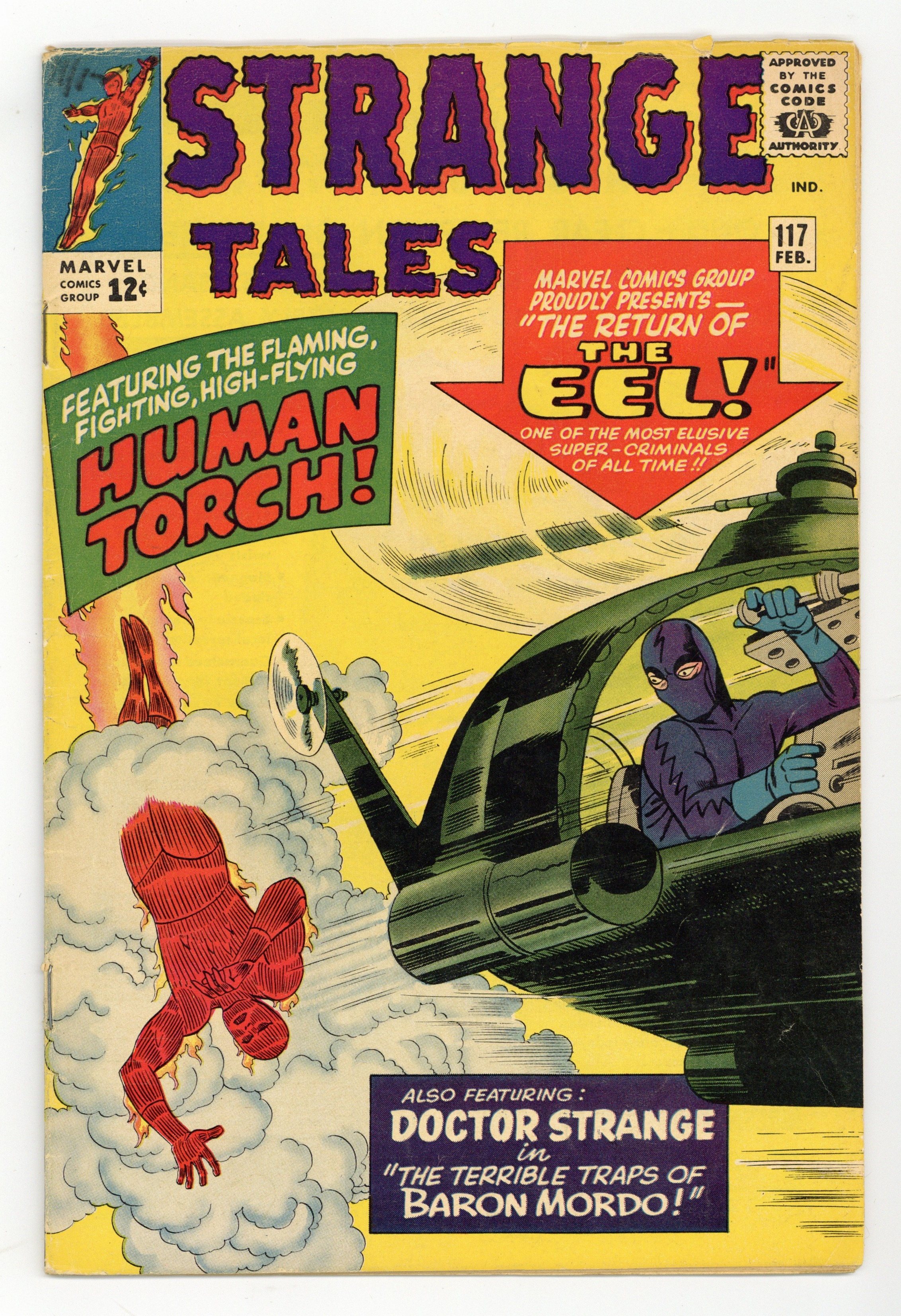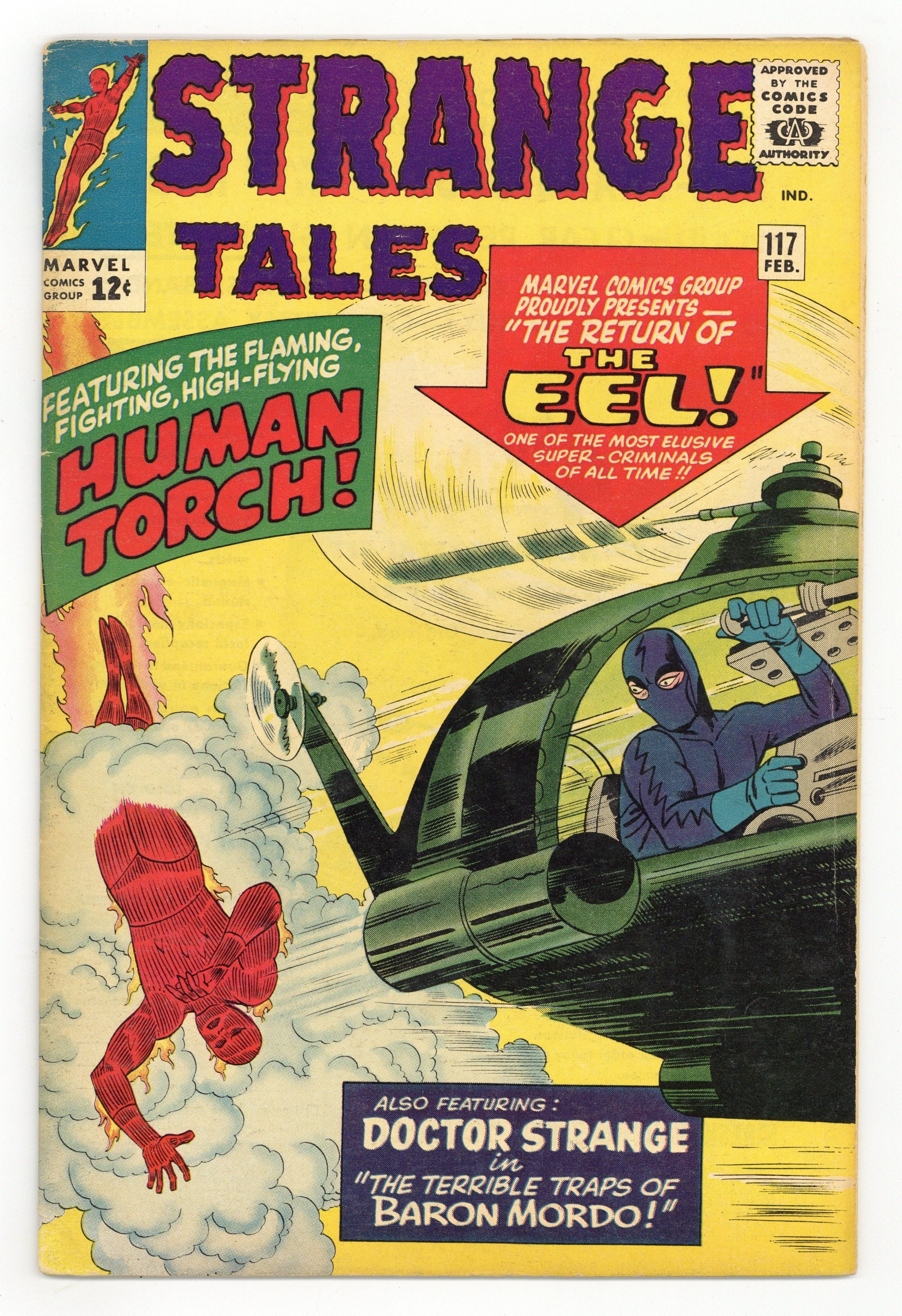 Cover pencils by Jack Kirby and Steve Ditko (Eel figure), inks by Sol Brodsky and Steve Ditko (Eel Figure). The Human Torch battles the Eel (from issue #112) in "The Return of the Eel!", script by Stan Lee (co-plot, script) and Dick Ayers (co-plot, un-credited), art by Dick Ayers; Having served his time, The Eel is released from jail, but Johnny's suspicious because he left prison wearing his Eel costume; Taking a security guard job at an aquarium, The Eel begins pulling crimes. "From Outer Space" text story. "The Many Traps of Baron Mordo!", script by Stan Lee and Steve Ditko (co-plot), art by Steve Ditko; Mordo places a spell over Strange's house that causes it to vanish to another dimension; Strange manages to track Mordo down using his ethereal form, but it becomes trapped in Mordo's lair; Mordo goes to see The Ancient One, claiming he's changed his way, just so he can attack him unawares. 36 pgs., full color. Cover price $0.12.
