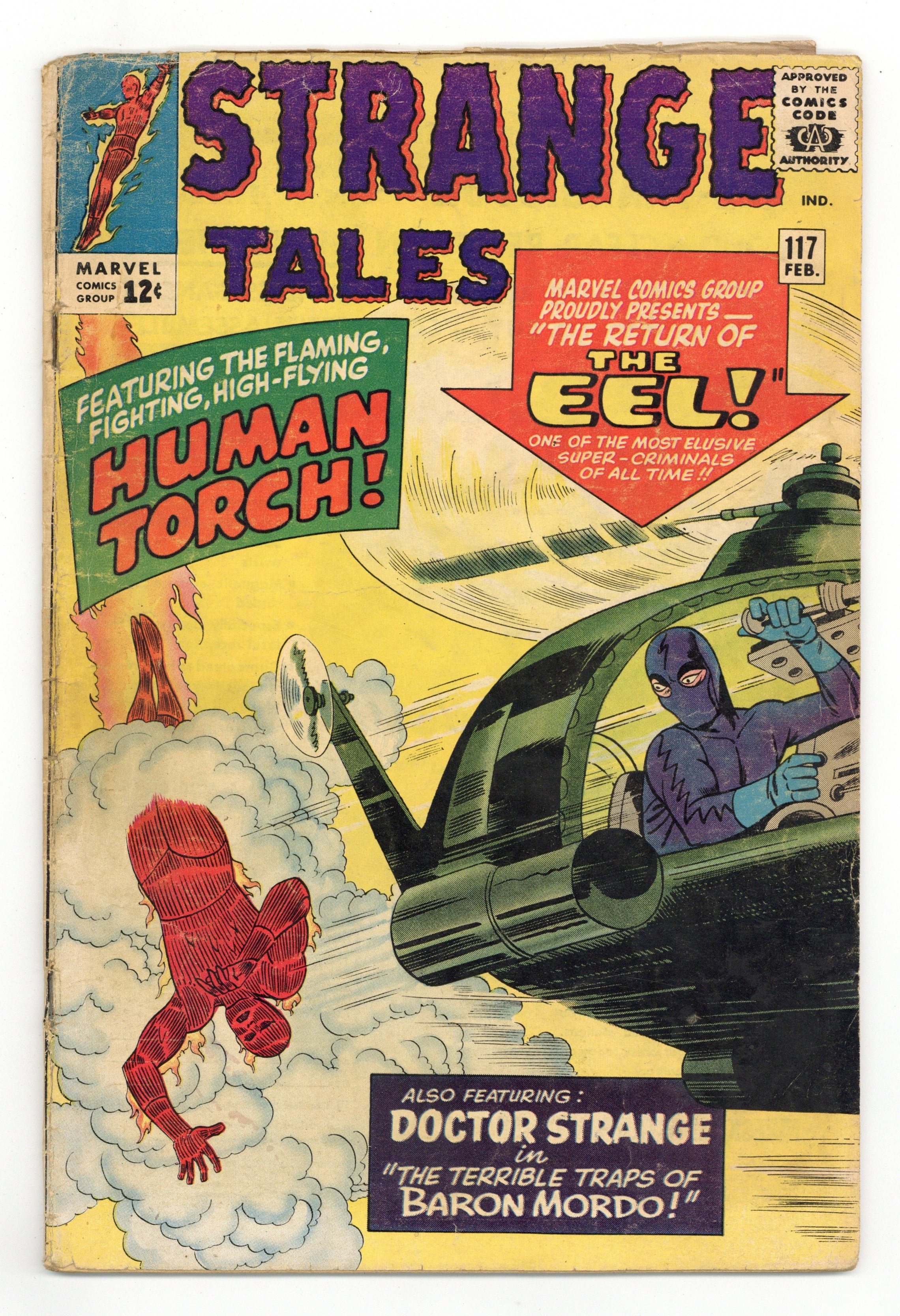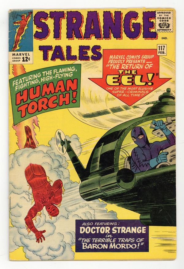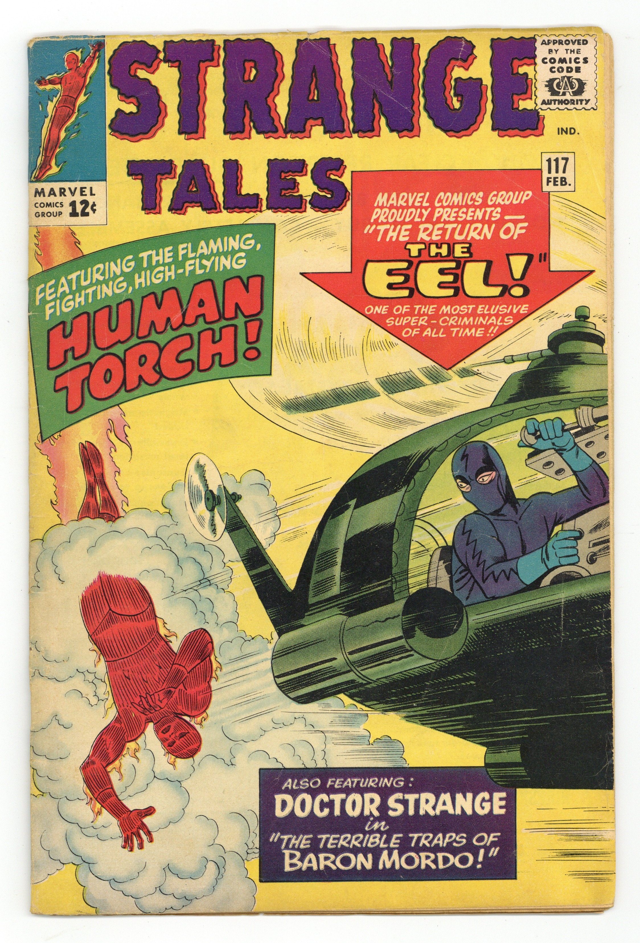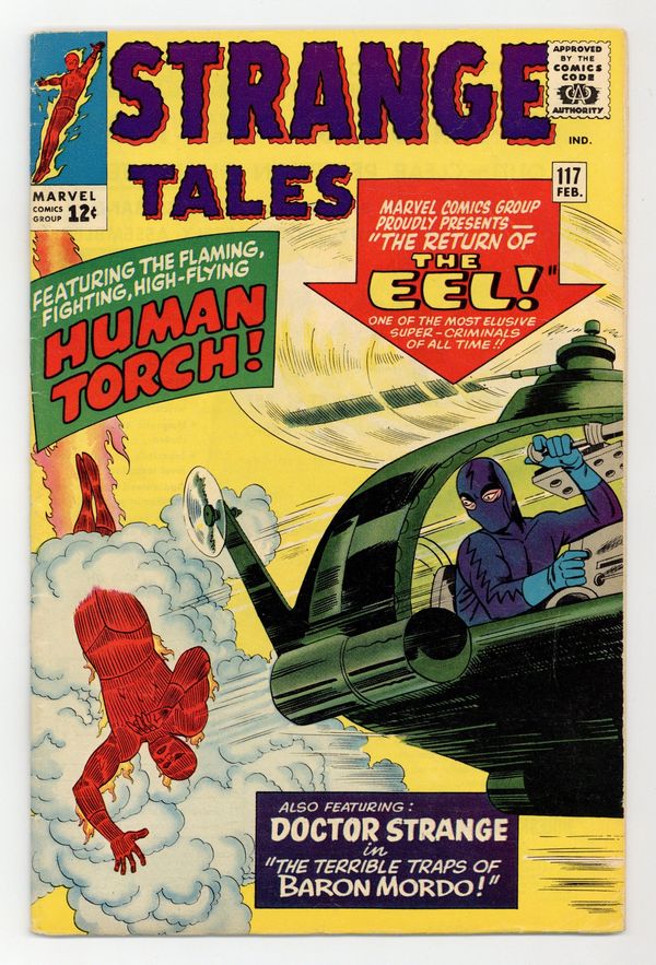 Cover pencils by Jack Kirby and Steve Ditko (Eel figure), inks by Sol Brodsky and Steve Ditko (Eel Figure). The Human Torch battles the Eel (from issue #112) in "The Return of the Eel!", script by Stan Lee (co-plot, script) and Dick Ayers (co-plot, un-credited), art by Dick Ayers; Having served his time, The Eel is released from jail, but Johnny's suspicious because he left prison wearing his Eel costume; Taking a security guard job at an aquarium, The Eel begins pulling crimes. "From Outer Space" text story. "The Many Traps of Baron Mordo!", script by Stan Lee and Steve Ditko (co-plot), art by Steve Ditko; Mordo places a spell over Strange's house that causes it to vanish to another dimension; Strange manages to track Mordo down using his ethereal form, but it becomes trapped in Mordo's lair; Mordo goes to see The Ancient One, claiming he's changed his way, just so he can attack him unawares. 36 pgs., full color. Cover price $0.12.