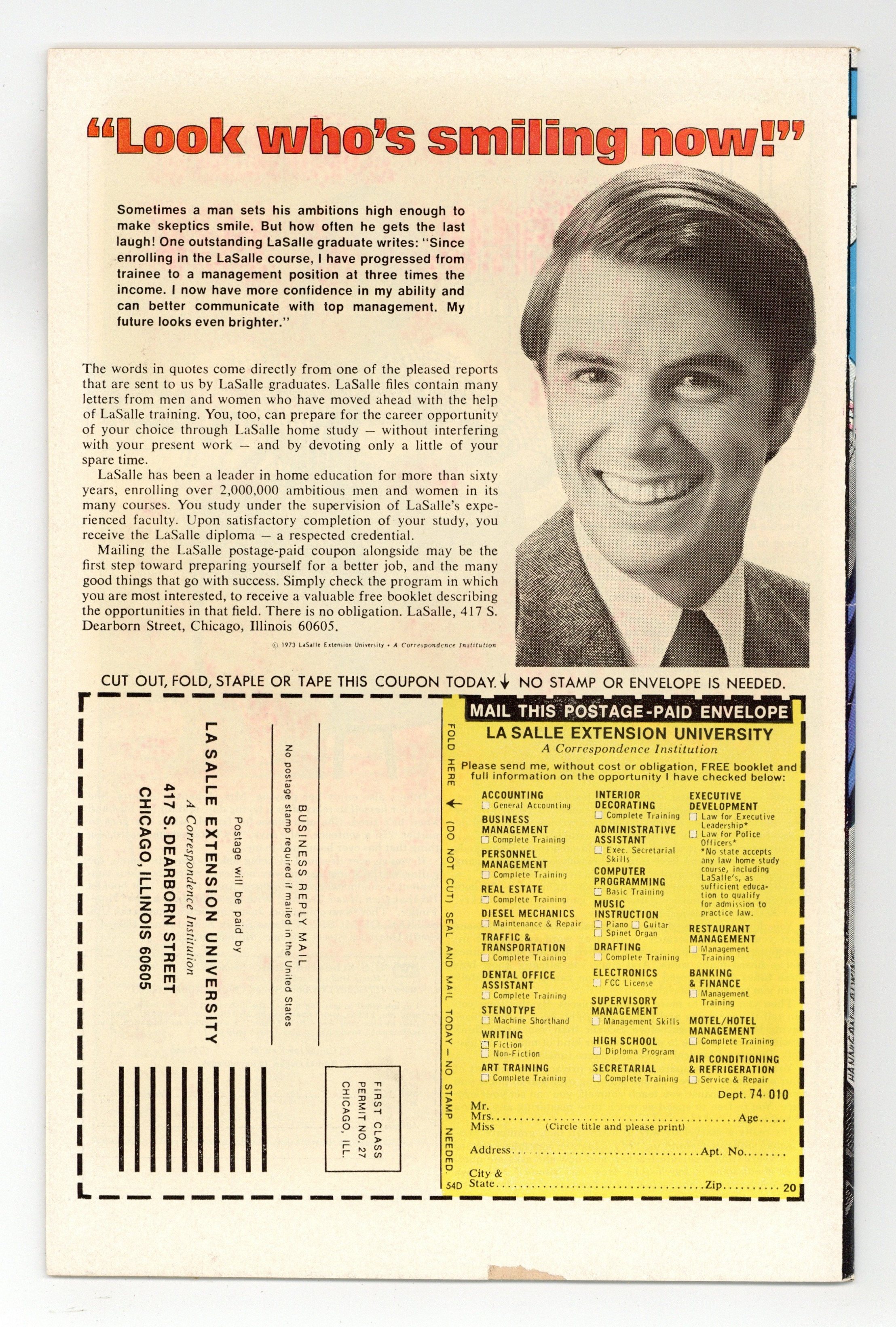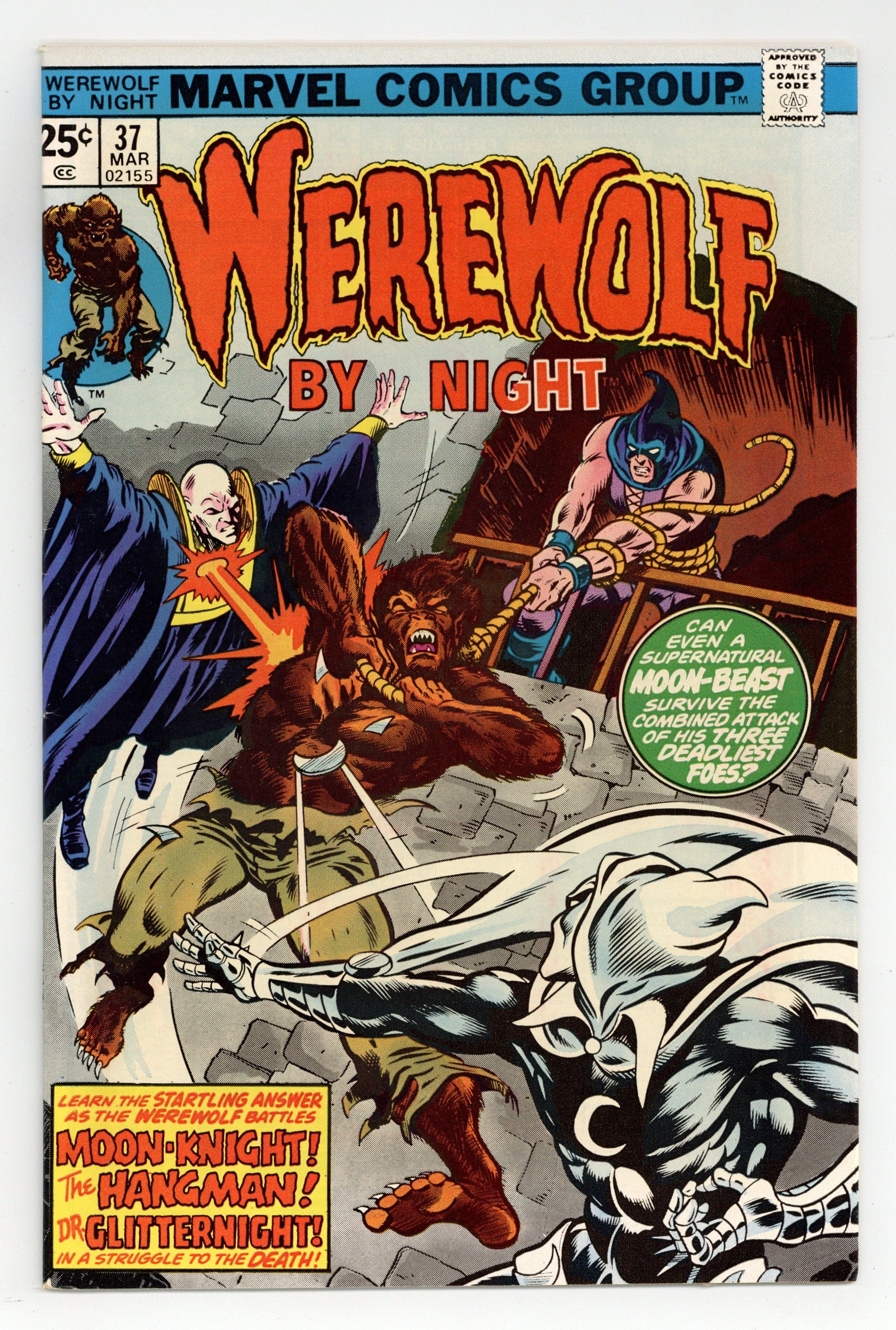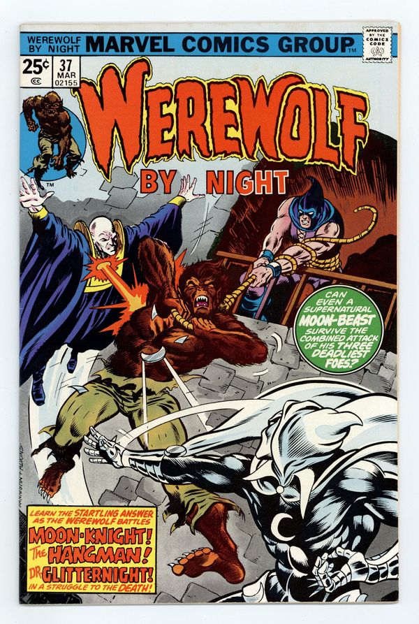 "Final Ending!" Guest-starring Moon Knight. Written by Doug Moench. Art by Don Perlin. Can even the werewolf survive the combined assault of his three deadliest foes - Moon Knight, the Hangman, and Dr. Glitternight?! This is it! Everything the past 36 issues of Werewolf by Night have been building up to comes to a head! Don't miss the stunning, soul-chilling conclusion! 32 pages, FC. Cover price $0.25.