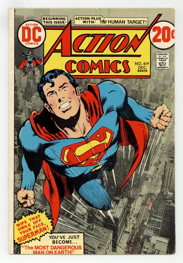 Cover pencils by Neal Adams, inks by Murphy Anderson, fumetti photo by Jack Adler. "The Most Dangerous Man on Earth!", script by Cary Bates, pencils by Curt Swan, inks by Murphy Anderson; Moe Malloy fishes a strange glowing gun and pair of shoes out of Metropolis harbor which give him super powers. First Appearance of the Human Target in "The Assassin-Express Contract!", script by Len Wein, pencils by Carmine Infantino and Dick Giordano, inks by Dick Giordano; The Human Target poses as a businessman on a train to stop an assassination. Letter to the editor from comics writer Bob Rozakis. 36 Pages, Full Color. $0.20 Cover price $0.20.