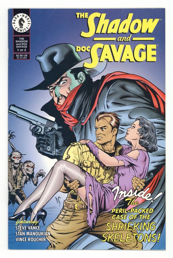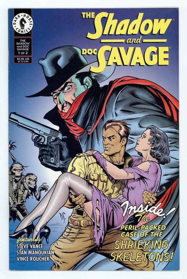 Tags: Pulp AdventurePublished Jul 1995 by Dark Horse.$48.00Written by Steve Vance. Art by Stan Manoukian and Vince Roucher. Cover by Dave Stevens. New York has always been a dangerous city, even as far back as the 1930s. But zombie-esque creatures and ape-like men are big news even for the Big Apple! When a gorgeous dame narrowly escapes their rotting clutches, she sends the bronze-skinned superman Doc Savage on the investigation of his lifetime! Who knows where the trail of corpses will lead? Who knows what evil lurks behind this rash of oddness? Savage isn't sure, but all fingers point to... The Shadow! FC. Cover price $2.95.
