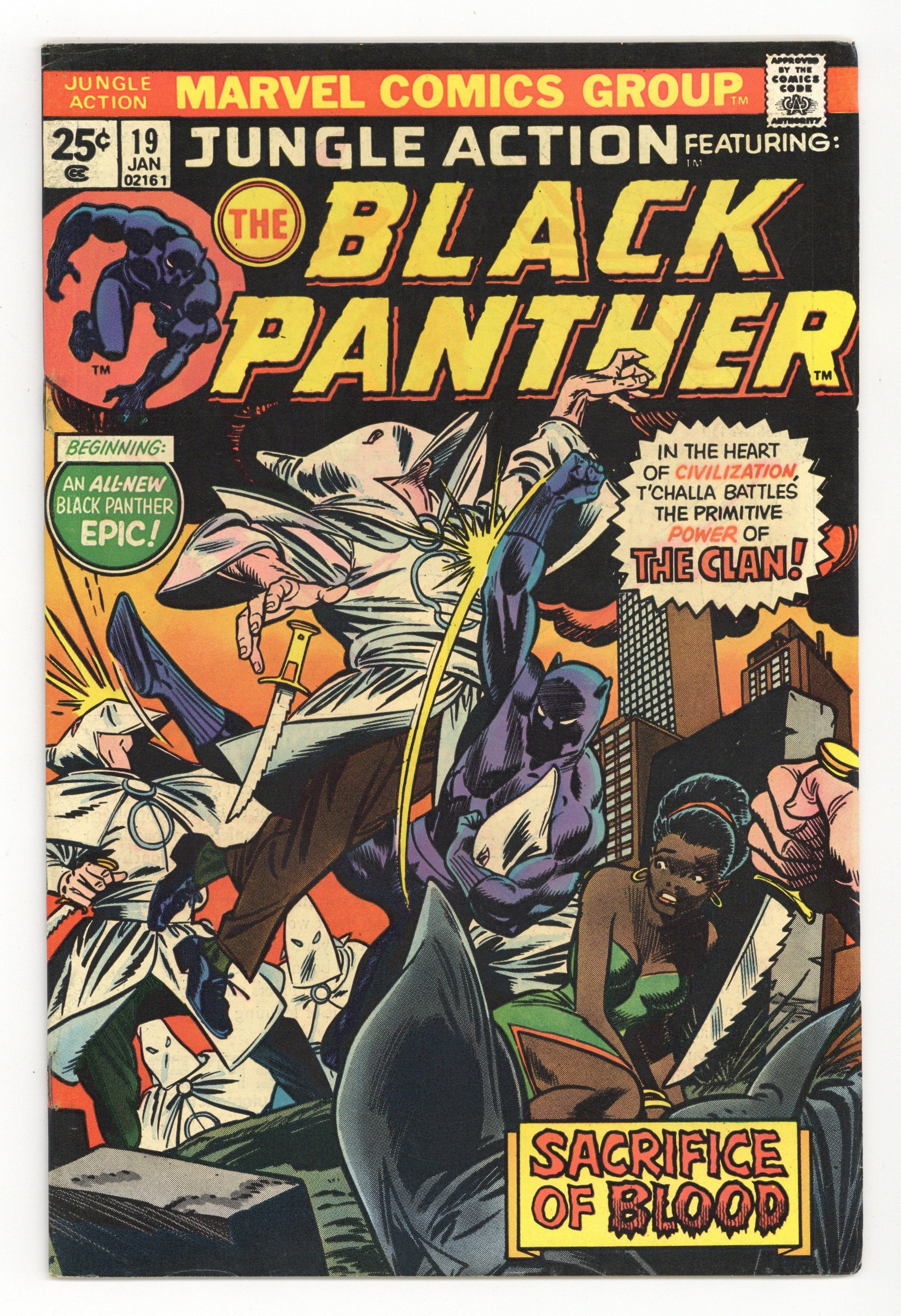 Cover pencils by Gil Kane, inks by Dan Adkins. The Black Panther stars in the Panther versus the Klan part 1, "Blood and Sacrifices, script by Don McGregor, pencils by Billy Graham, inks by Bob McLeod; The Panther and Monica visit her parents in Georgia; They are attacked by the Dragon's Circle and the Ku Klux Klan. Letters from comics writers Stan Timmons and Bruce Canwell. 36 pgs., full color. Cover price $0.25.
