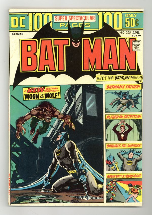 New story, "Moon of the Wolf." (script by Len Wein, pencils by Neal Adams, inks by Dick Giordano; 20 pages). Reprints: "The First Batman" (script by Bill Finger, art by Bob Kane; from Detective # 325), "The Duped Domestics" (art by Jerry Robinson; from Batman # 22), Batgirl guest stars in "The True-False Face of Batman" (script by Gardner Fox, pencils by Carmine Infantino, inks by Sid Greene; from Detective # 363), Robin in "Crazy-Quilt Comes Back!" (script by France E. Herron, art by Jim Mooney; from Star-Spangled Comics # 123), and "The Outsider Strikes Again" (script by Gardner Fox; from Detective # 340). Letters to the editor from comics writers Elliot S. Maggin and Mike Barr. 100 Pages, Full Color. Cover price $0.50.