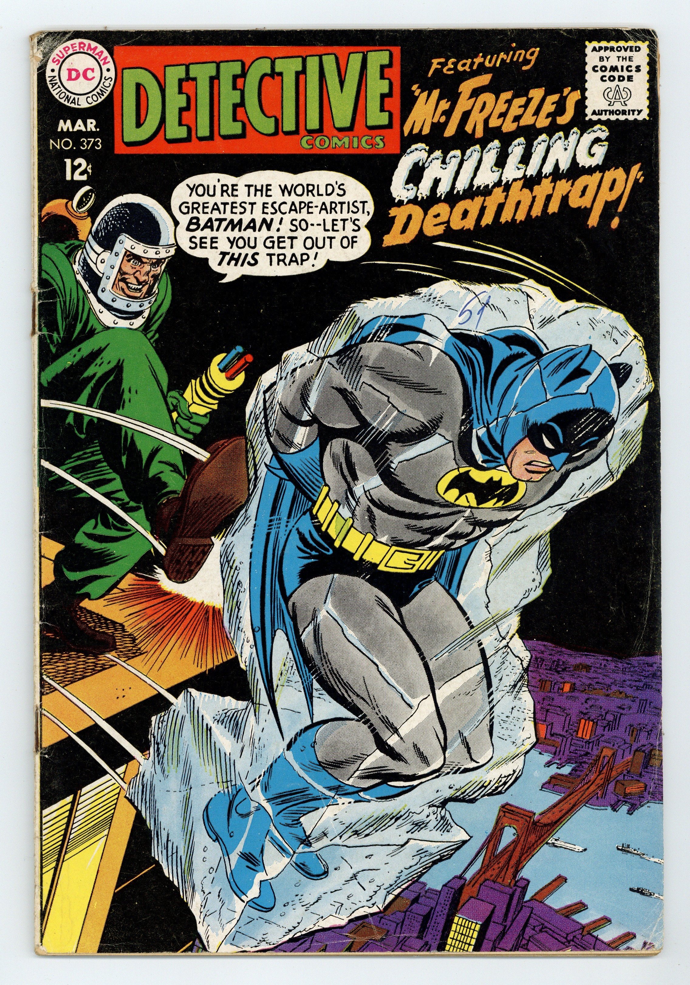 Written by Gardner Fox. Art by Chic Stone (ghosting for Bob Kane) and Sid Greene. Cover art by Irv Novick. Mr. Freeze's Chilling Deathtrap!; Aunt Harriet needs cryosurgery to save her life; unfortunately, the freezing machine in the hospital breaks; enter Mr. Freeze, who could help; Batman fights Mr. Freeze. Written by Gardner Fox. Art by Gil Kane and Sid Greene. The Riddler on the Roof!; while visiting Gotham City, Ralph Elongated Man Dibny answers the Bat-Signal, hoping to meet Batman and Robin; unfortunately, Batman is out of town; Elongated Man battles the Riddler. Statement of ownership--average print run 665,000; average paid circulation 426,300. Letter to the editor from Irene Vartanoff. 36 pages, full color. $0.12. Cover price $0.12.