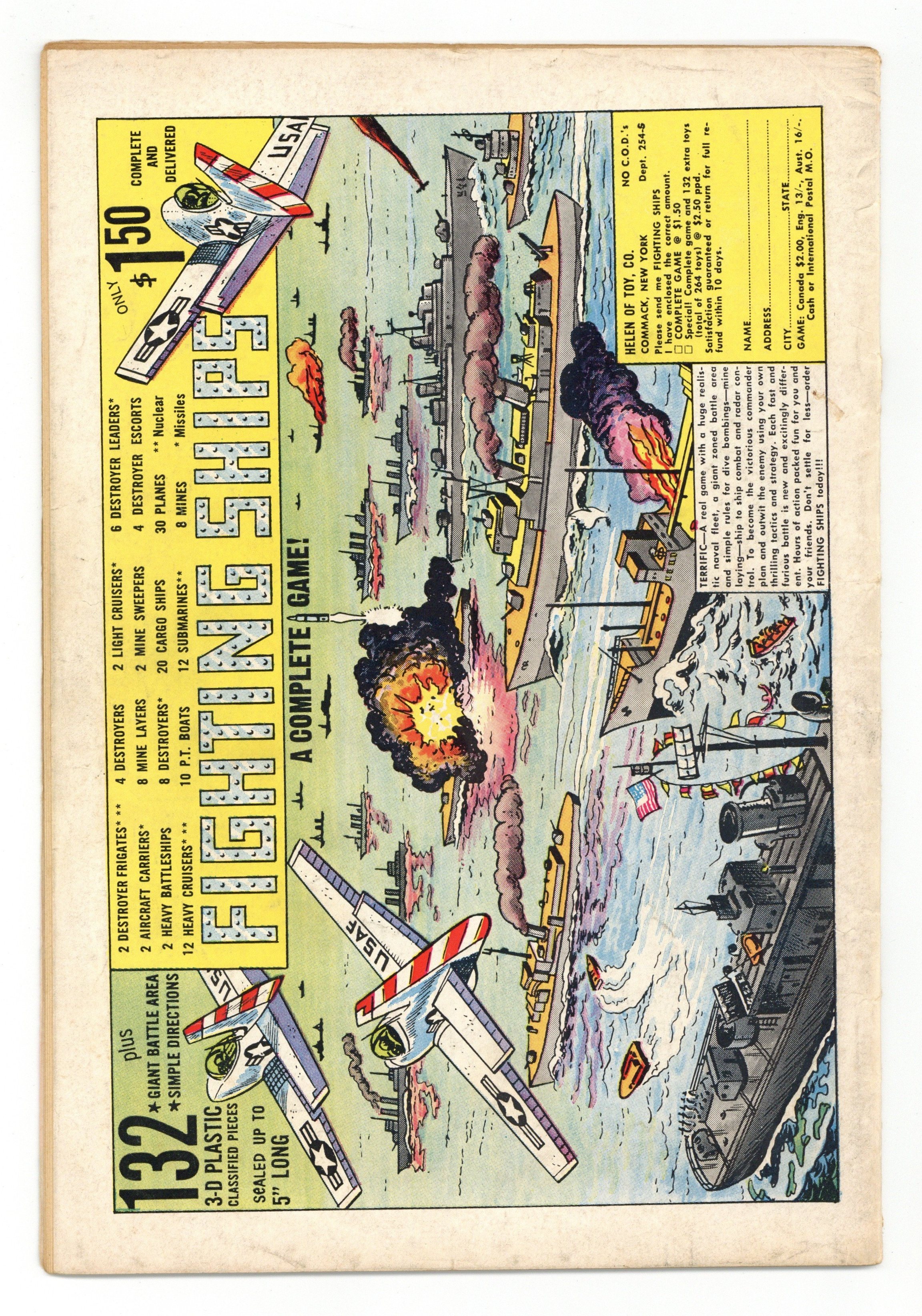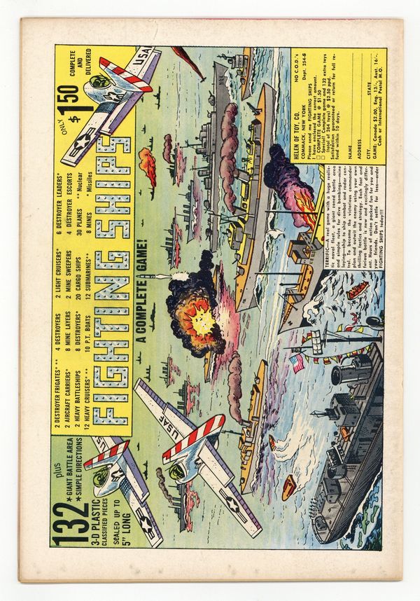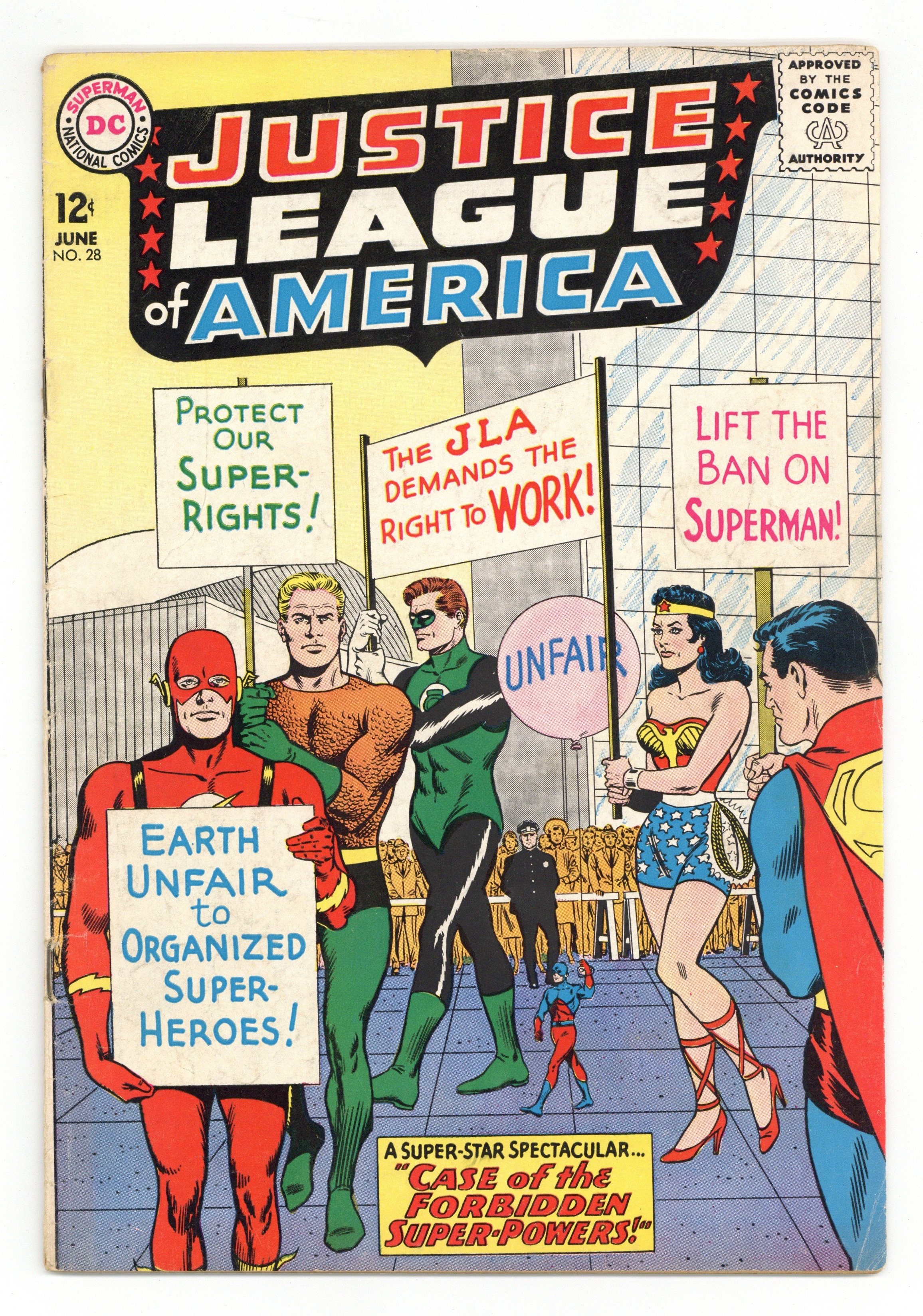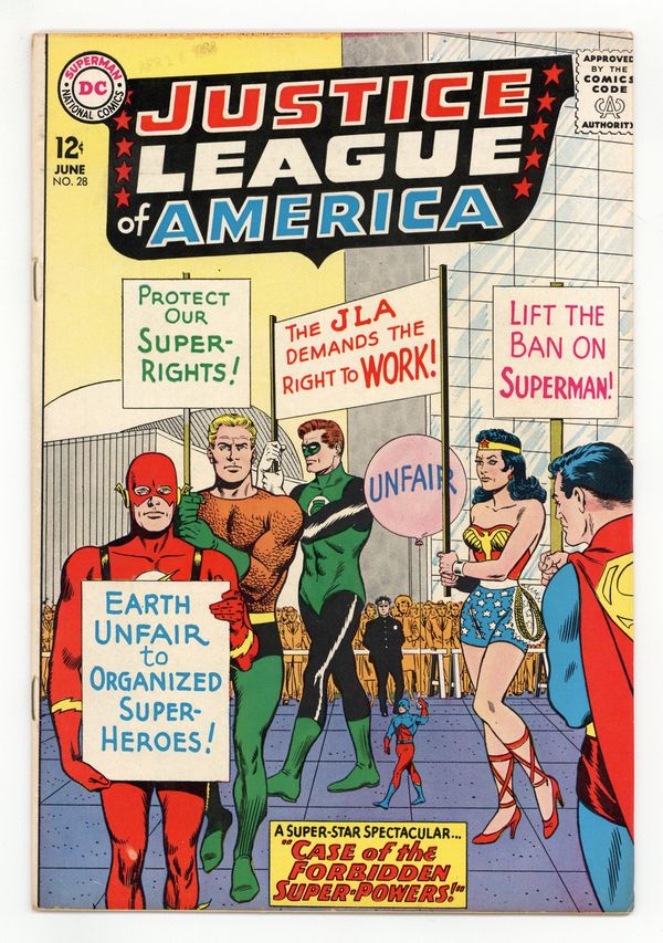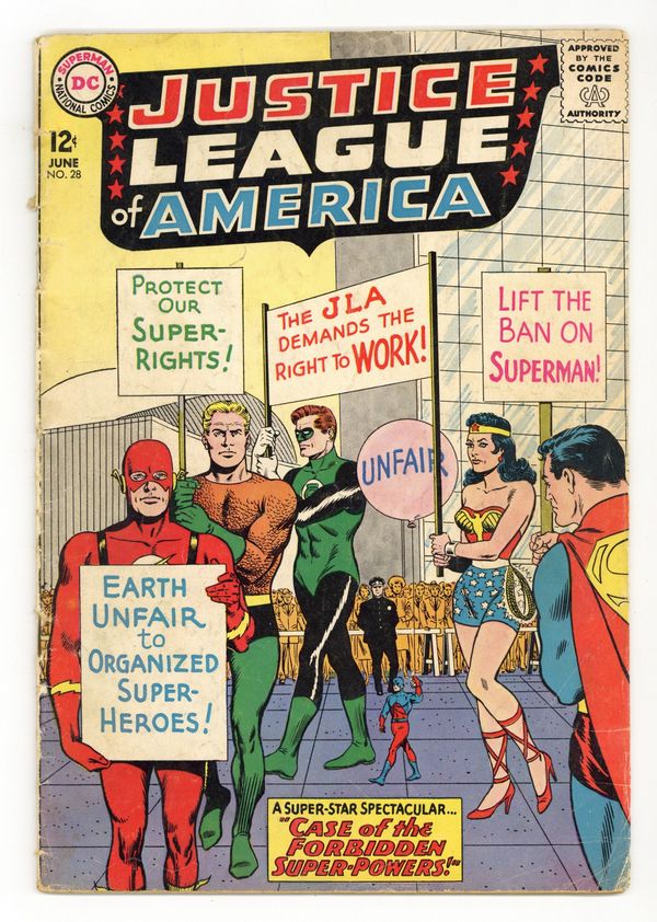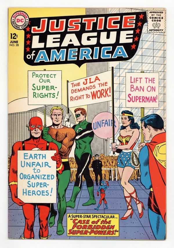 Cover pencils by Mike Sekowsky, inks by Murphy Anderson. The Case of the Forbidden Super-Powers!, script by Gardner Fox, pencils by Mike Sekowsky, inks by Bernard Sachs; Headmaster Mind invents a device which creates natural disasters whenever the JLAers use their powers; Batman's and Green Arrow's failed efforts to stop Headmaster Mind's students Matter Master, Tattooed Man, and the Top without super-powers encourage the other JLAers to take them on without using their special abilities, while Batman and Green Arrow attack Headmaster Mind and his device. 36 pgs. $0.12. Cover price $0.12.