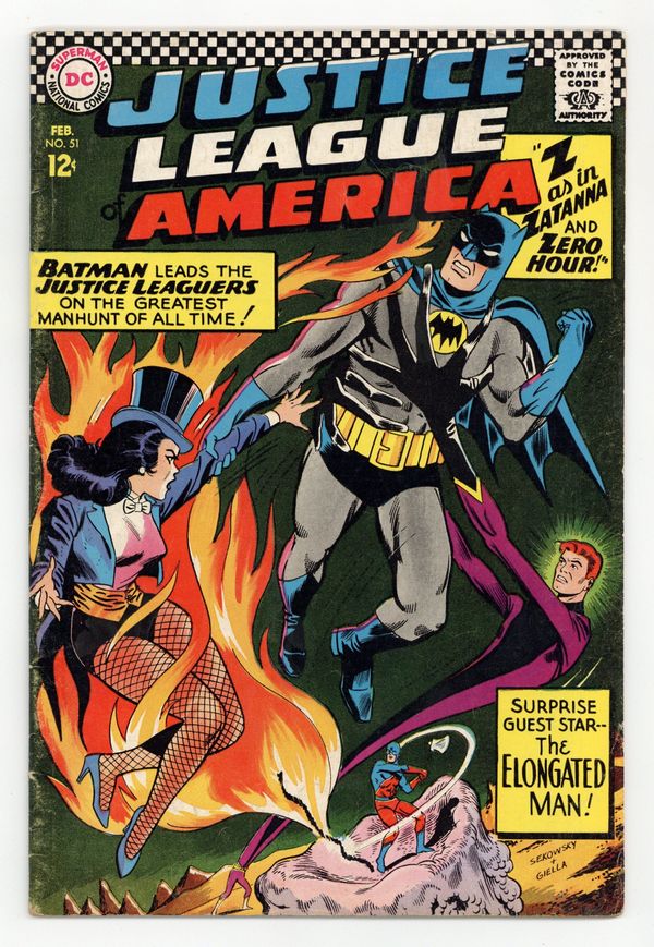 Starts Jan 26 "Z--As in Zatanna--and Zero Hour!" with story by Gardner Fox, art by Mike Sekowsky and inks by Sid Greene, guest-stars Zatanna and the Elongated Man. When awesome magical powers threaten Zatanna's like as she searches for his missing father, Zatara, the Justice League of America come to the rescue! This issue's roll call: The Atom, Batman, Green Lantern and Hawkman. Full page ad for Batman poster pin-up set--just $1.00 for all. Circulation numbers reported in Statement of Ownership showing average number of copies for preceeding 12 months: 654,000. Letter in this issue from early comic fandom writer Irene Vartanoff. Cover price $0.12.