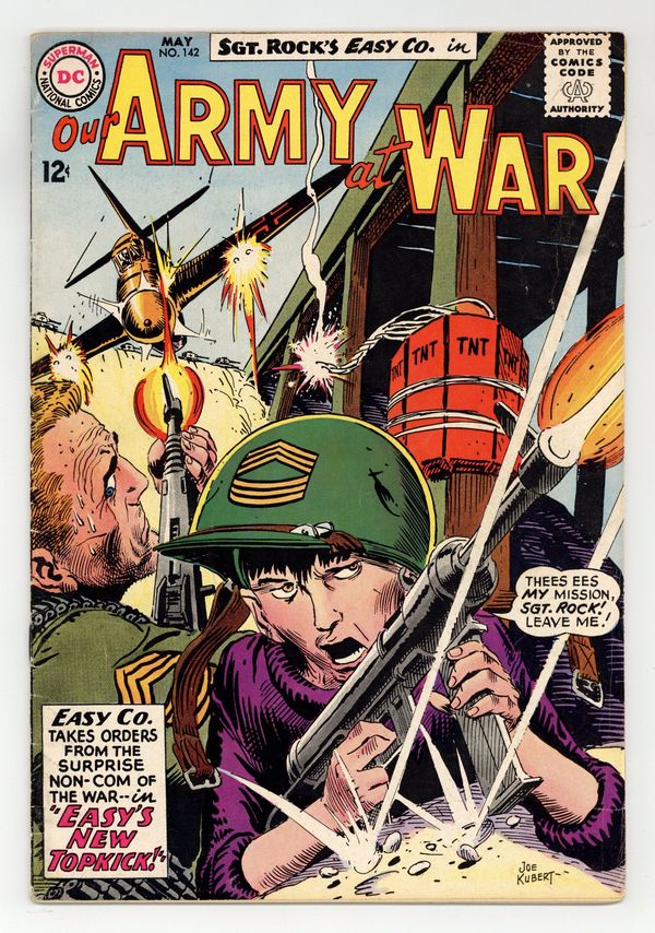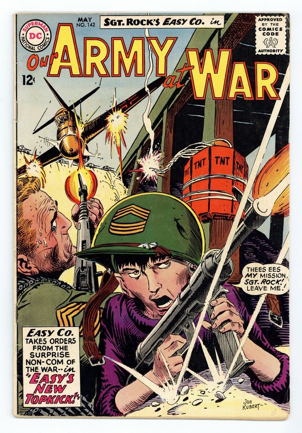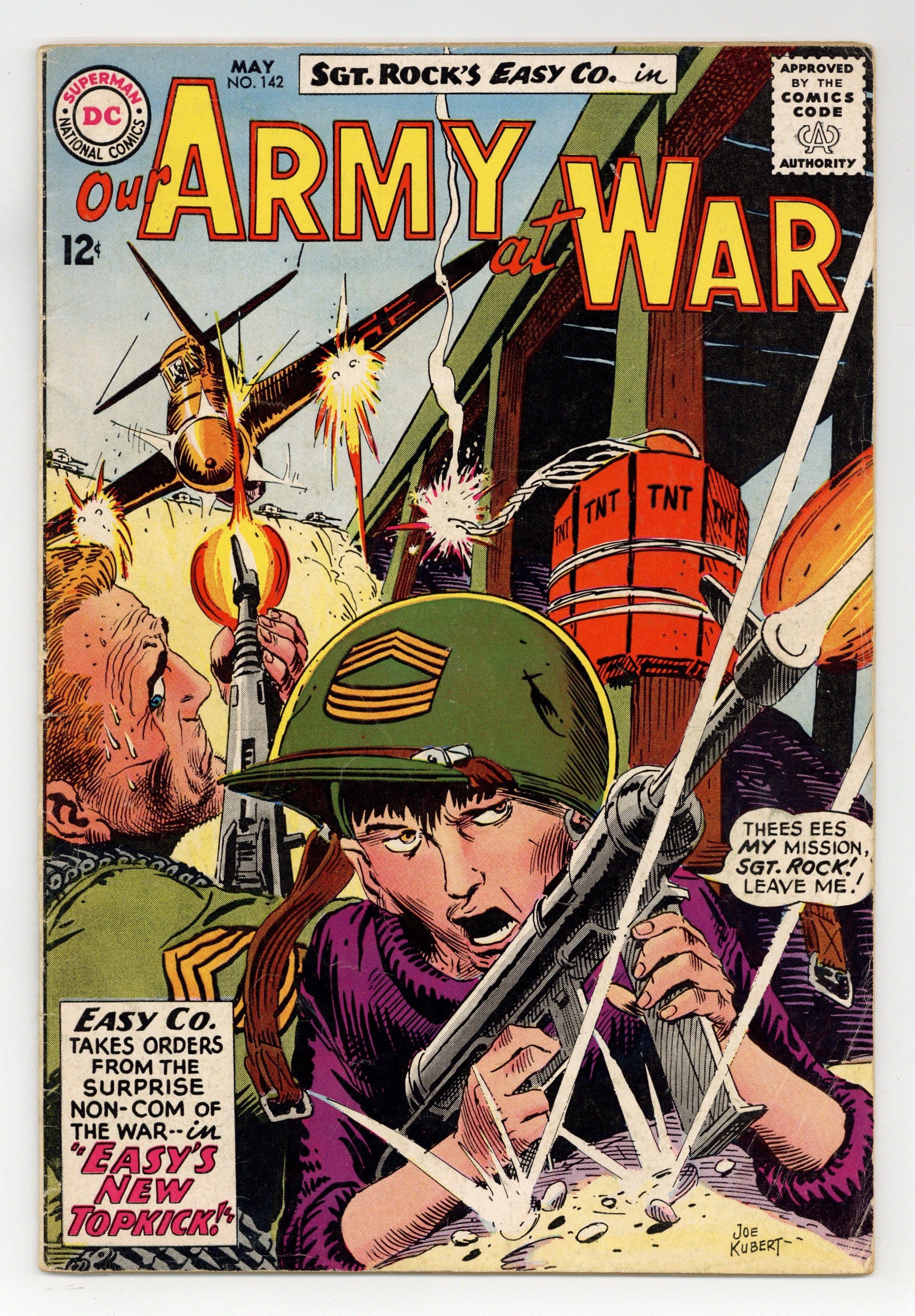 Cover art by Joe Kubert. Easy's New Topkick starring Sgt Rock, script by Bob Kanigher, art by Joe Kubert. Nose-Dive Champ, script by Kin Platt, art by Jack Abel. War Mottoes fact page. 36 Pages, Full Color. Cover price $0.12.