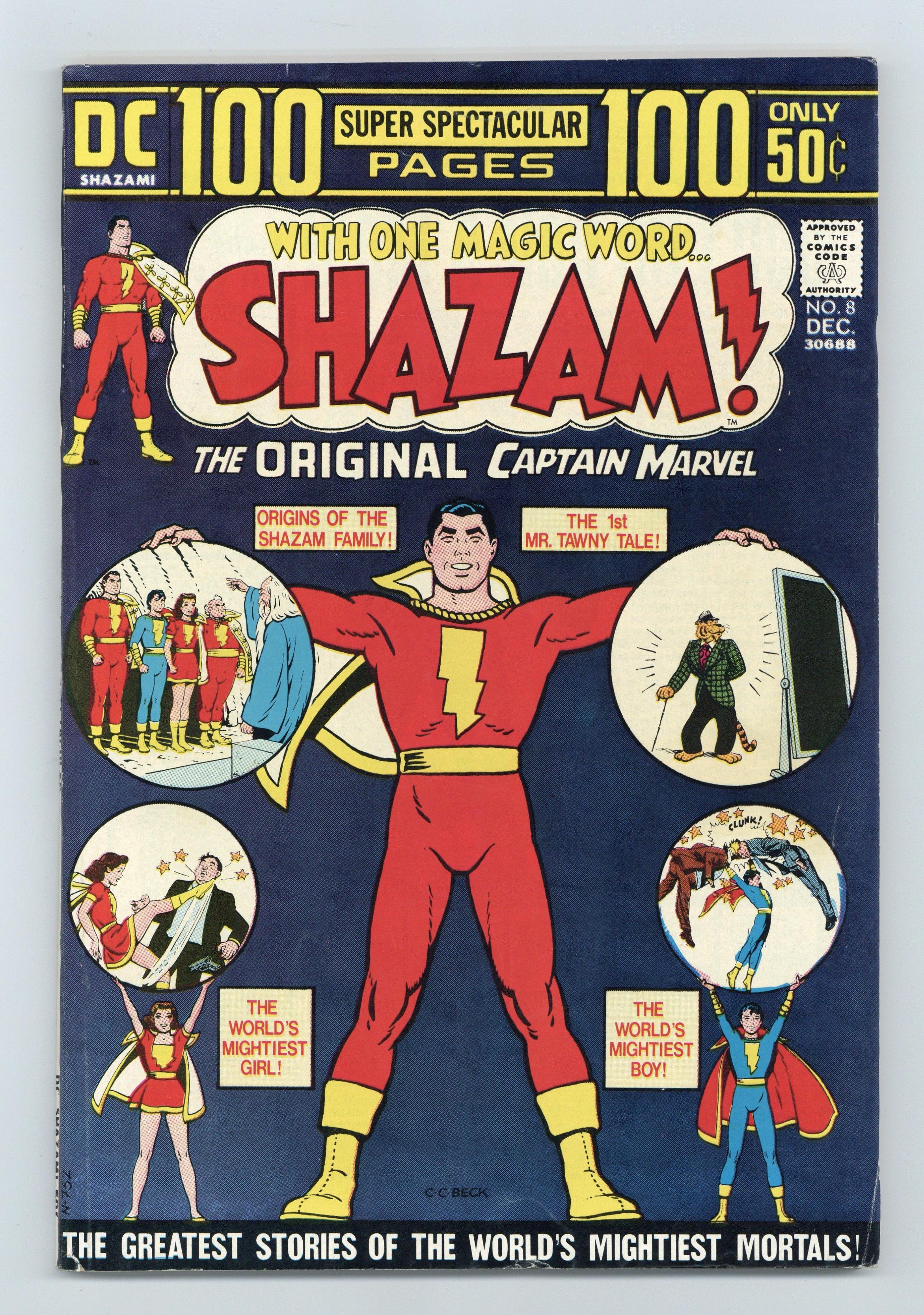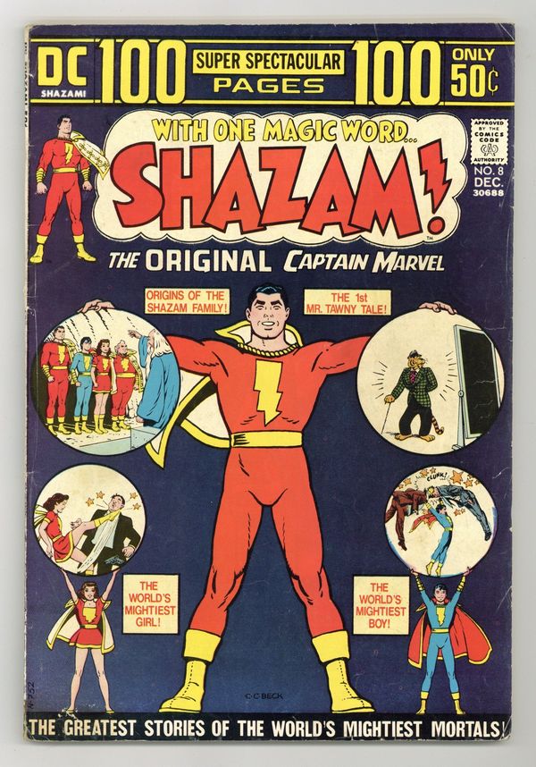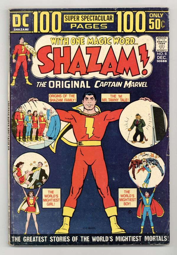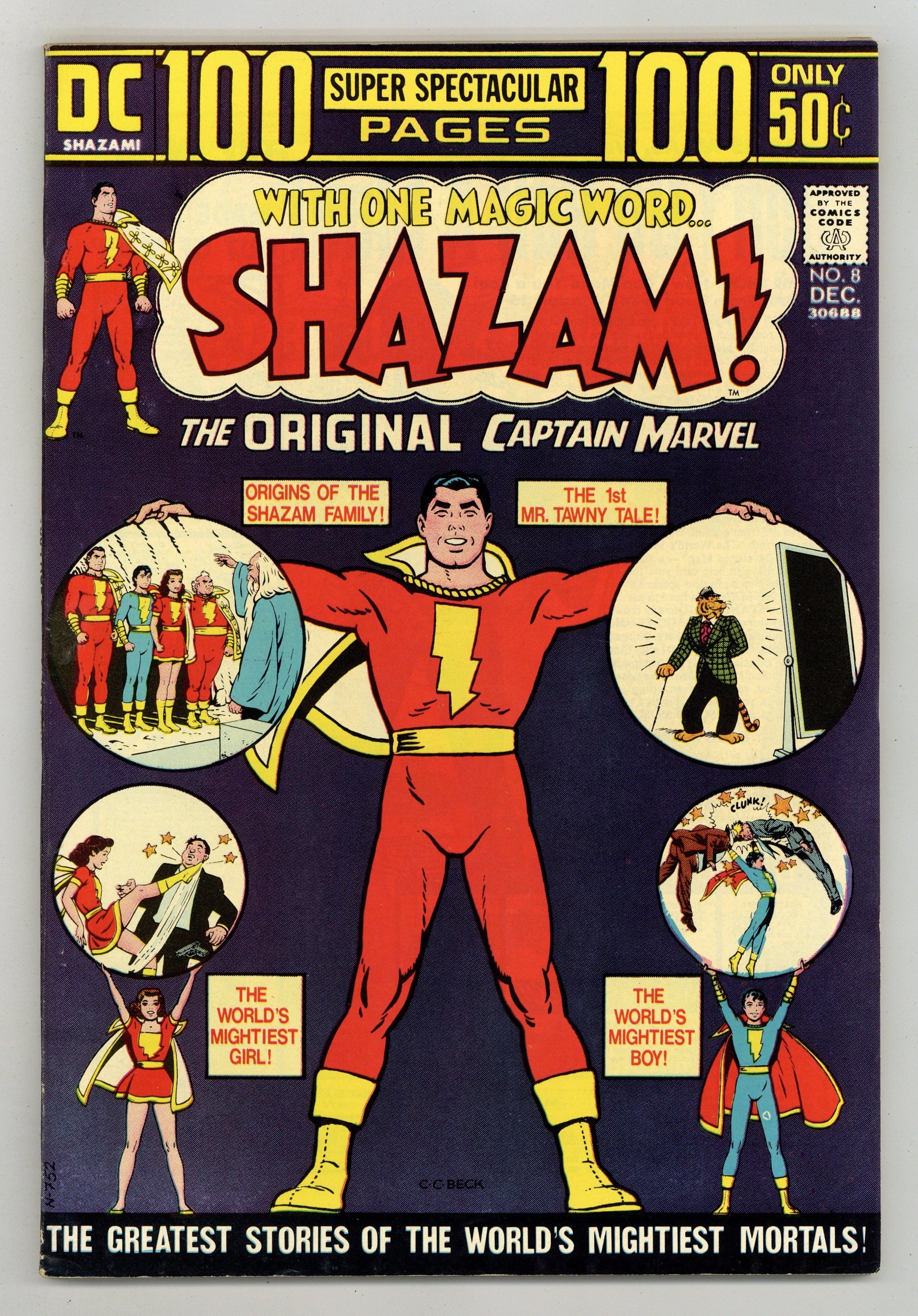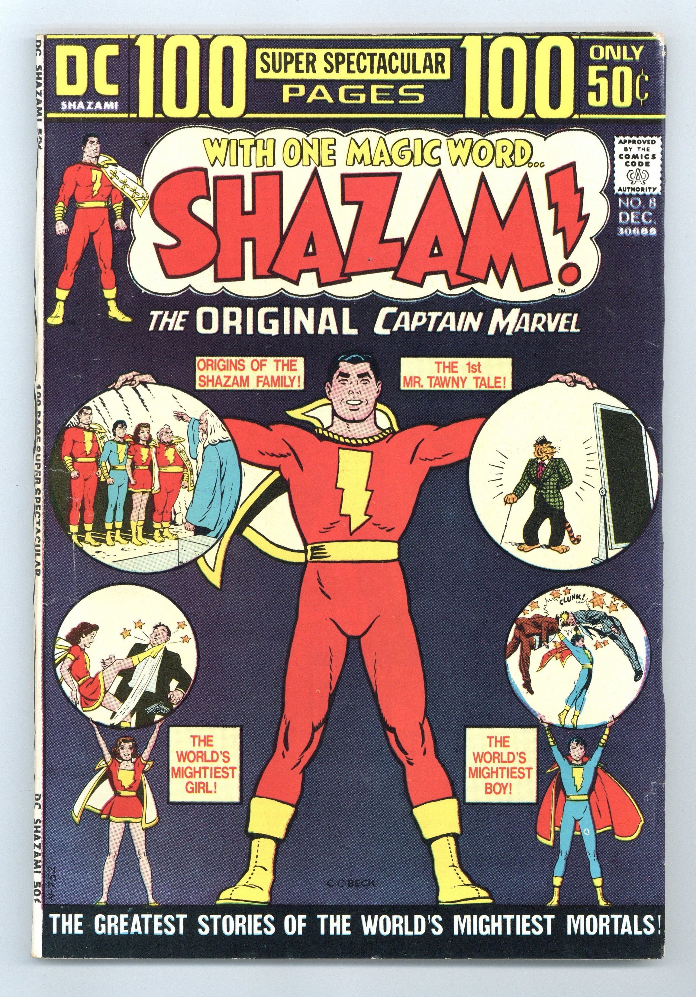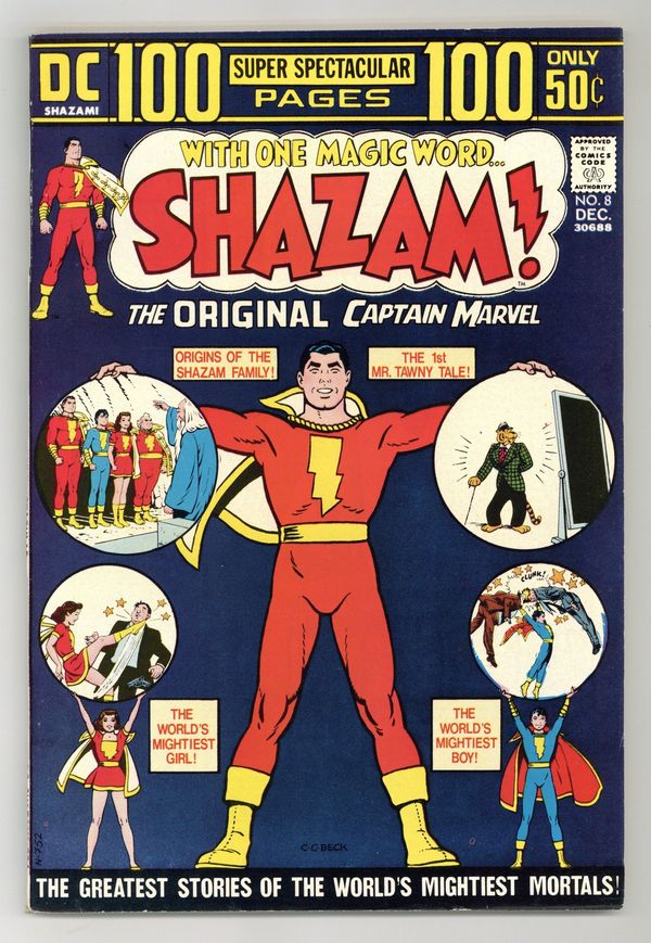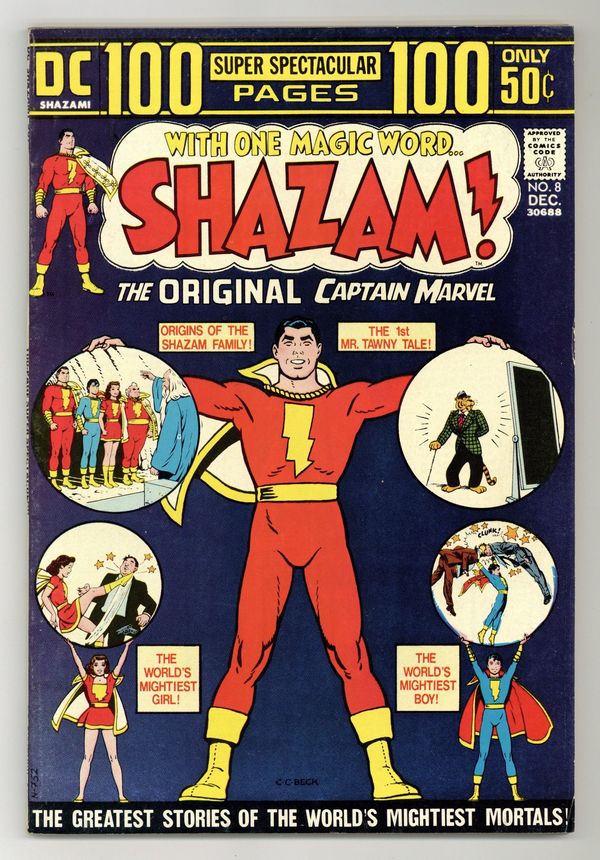 Tags: DC 100 Page Giant$37.00100-page giant; all reprints. "A Twice-Told Tale" (from Captain Marvel Adventures 80 in 1947), "The Original Captain Marvel Introduces Mary Marvel" (from CMA 18 in 1942; script by Otto Binder), "The Mighty Marvels Join Forces" (from Marvel Family 1 in 1945), "Captain Marvel Jr. and the Vest Pocket Levitator" (from Captain Marvel Junior 14 in 1943; art by Mac Raboy), "Mary Marvel and the Dog-Nappers" (from Mary Marvel 17 in 1947; art by Jack Binder), "The Original Captain Marvel and his Three Lieutenant Marvels in the Adventure in Time" (from CMA 71 in 1947), "The Talking Tiger" (from CMA 79 in 1947; script by Binder, art by C.C. Beck), and "The Return of Mr. Tawny" (from CMA 82 in 1948). New Beck cover. Cover price $0.50.