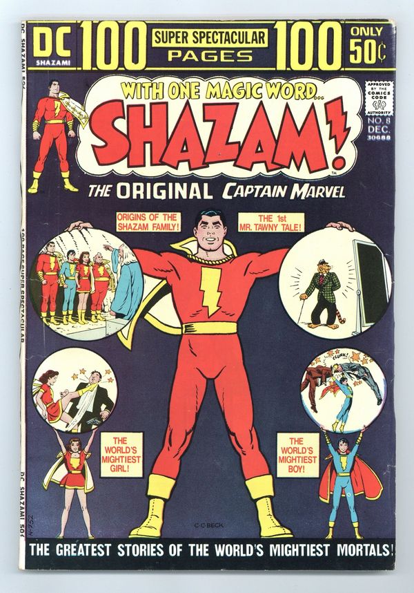 100-page giant; all reprints. "A Twice-Told Tale" (from Captain Marvel Adventures 80 in 1947), "The Original Captain Marvel Introduces Mary Marvel" (from CMA 18 in 1942; script by Otto Binder), "The Mighty Marvels Join Forces" (from Marvel Family 1 in 1945), "Captain Marvel Jr. and the Vest Pocket Levitator" (from Captain Marvel Junior 14 in 1943; art by Mac Raboy), "Mary Marvel and the Dog-Nappers" (from Mary Marvel 17 in 1947; art by Jack Binder), "The Original Captain Marvel and his Three Lieutenant Marvels in the Adventure in Time" (from CMA 71 in 1947), "The Talking Tiger" (from CMA 79 in 1947; script by Binder, art by C.C. Beck), and "The Return of Mr. Tawny" (from CMA 82 in 1948). New Beck cover. Cover price $0.50.