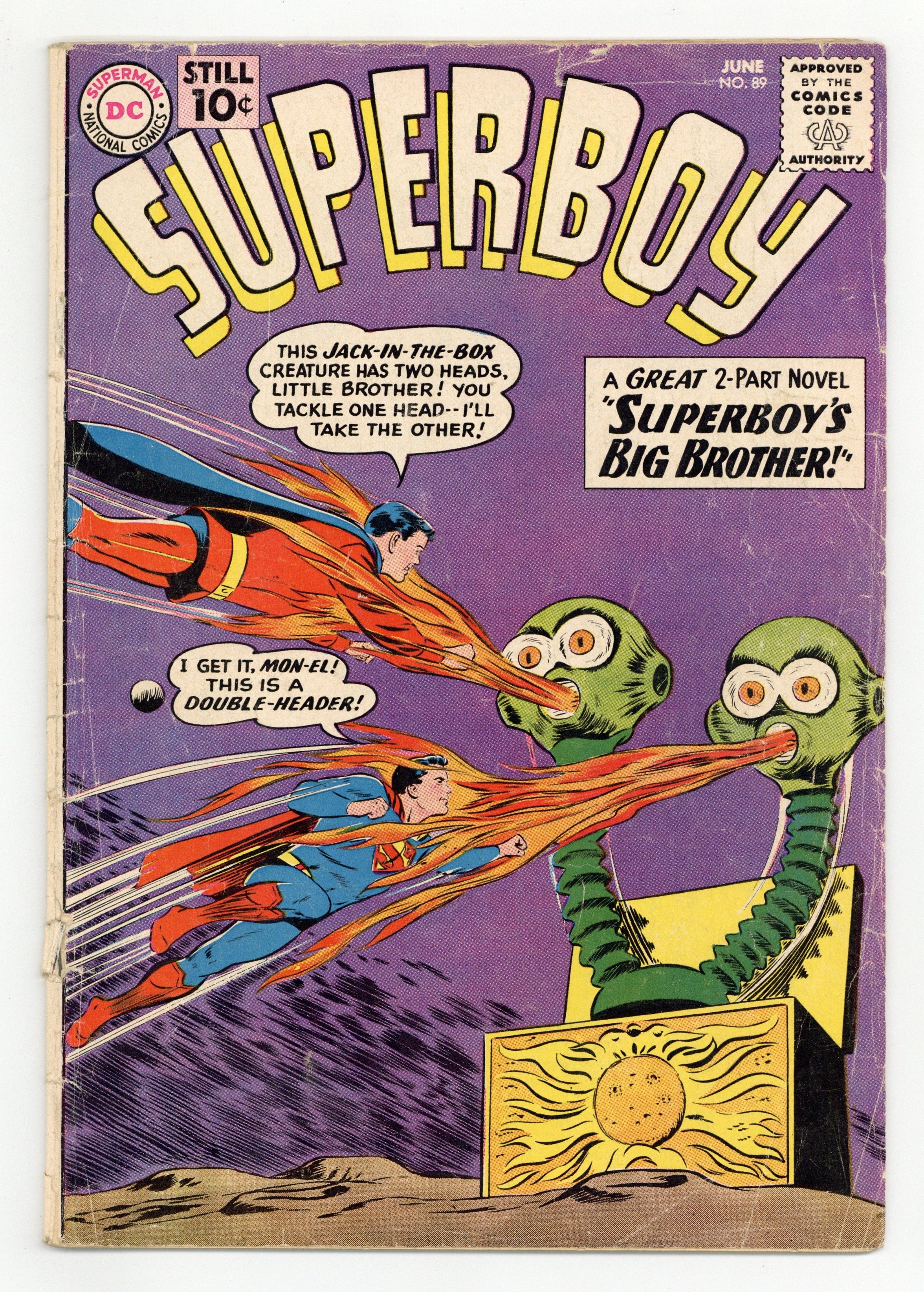 1st appearance of Mon-El. Cover pencils by Curt Swan, inks by Stan Kaye. Superboy's Big Brother!, script by Robert Bernstein, art by George Papp; When a spaceship crashes outside Smallville, Superboy finds an amnesiac, super-powered youth who might be his older brother. The Secret of Mon-El! [Superboy's Big Brother!], script by Robert Bernstein, art by George Papp; Trying to prove Mon-El isn't actually Kryptonian, Superboy accidentally exposes him to lead. Ollie humor page by Henry Boltinoff. The Super-Cop of Smallville!, script by Jerry Siegel, pencils by Curt Swan. 36 Pages, Full Color. Cover price $0.10.