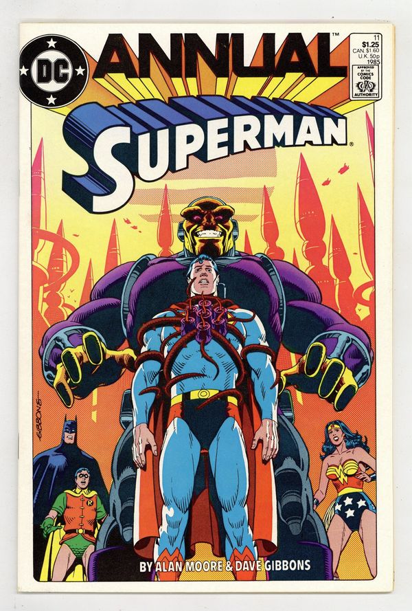 Direct Edition. "For the Man Who Has Everything!" Guest-starring Wonder Woman, and Batman and Robin. Written by Alan Moore. Art by Dave Gibbons. The amazing creative team that brought you Watchmen deliver one of the all-time great Superman tales. When Batman and Wonder Woman arrive at the Fortress of Solitude for Superman's birthday, they soon discover the evil Mongul has beat them there and enslaved the Man of Steel within a prison of his own mind. How can they possibly hope to defeat this monstrous alien menace without the help of Superman? 48 pages, FC. Cover price $1.25.