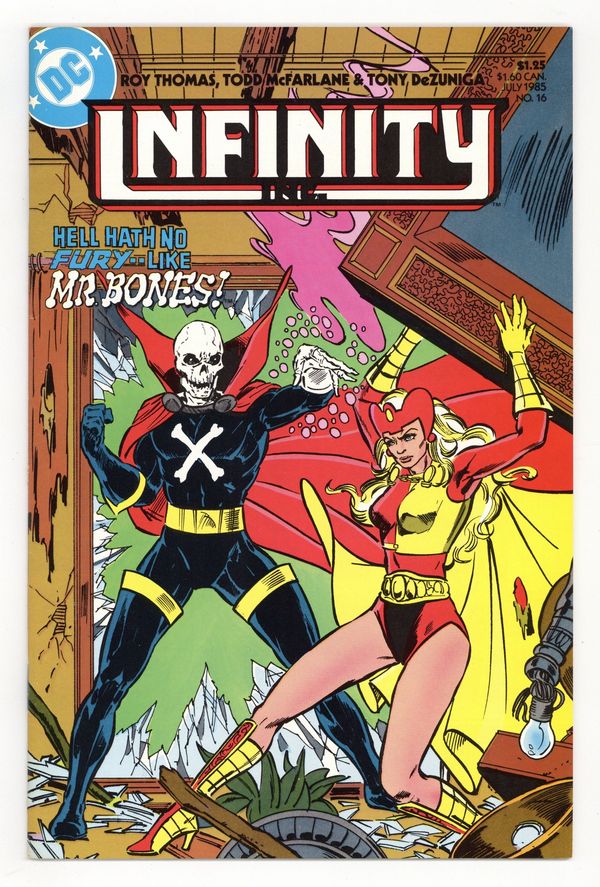 Fury faces Mr. Bones' cyanide touch when he crashes the team's Malibu pad in "They Call Him...Mr. Bones!" Part 1 of 3, continued next issue. Script by Roy Thomas, co-plot by Dann Thomas, pencils by Todd McFarlane, inks by Tony DeZuniga. McFarlane/DeZuniga cover. Cover price $1.25.