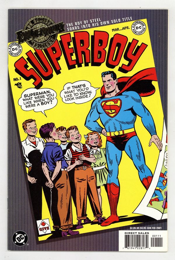Reprints of Superboy #1. WRITTEN BY DON CAMERON, BILL FINGER, CLIFF RHODES, HENRY BOLTINOFF, AND VARIOUS; ART BY JOHN SIKELA, ED DOBROTKA, AND BOLTINOFF; COVER BY WAYNE BORING. The final Millennium Edition selected by online voting! This 1949 issue saw the Boy of Steel fly into adventure against such adversaries as Mighty Boy and the Boy Vandals! Also, Superboy meets the Man who Could See Tomorrow and tests his speed against a futuristic rocket plane! FC, 48 PG. Cover price $2.95.