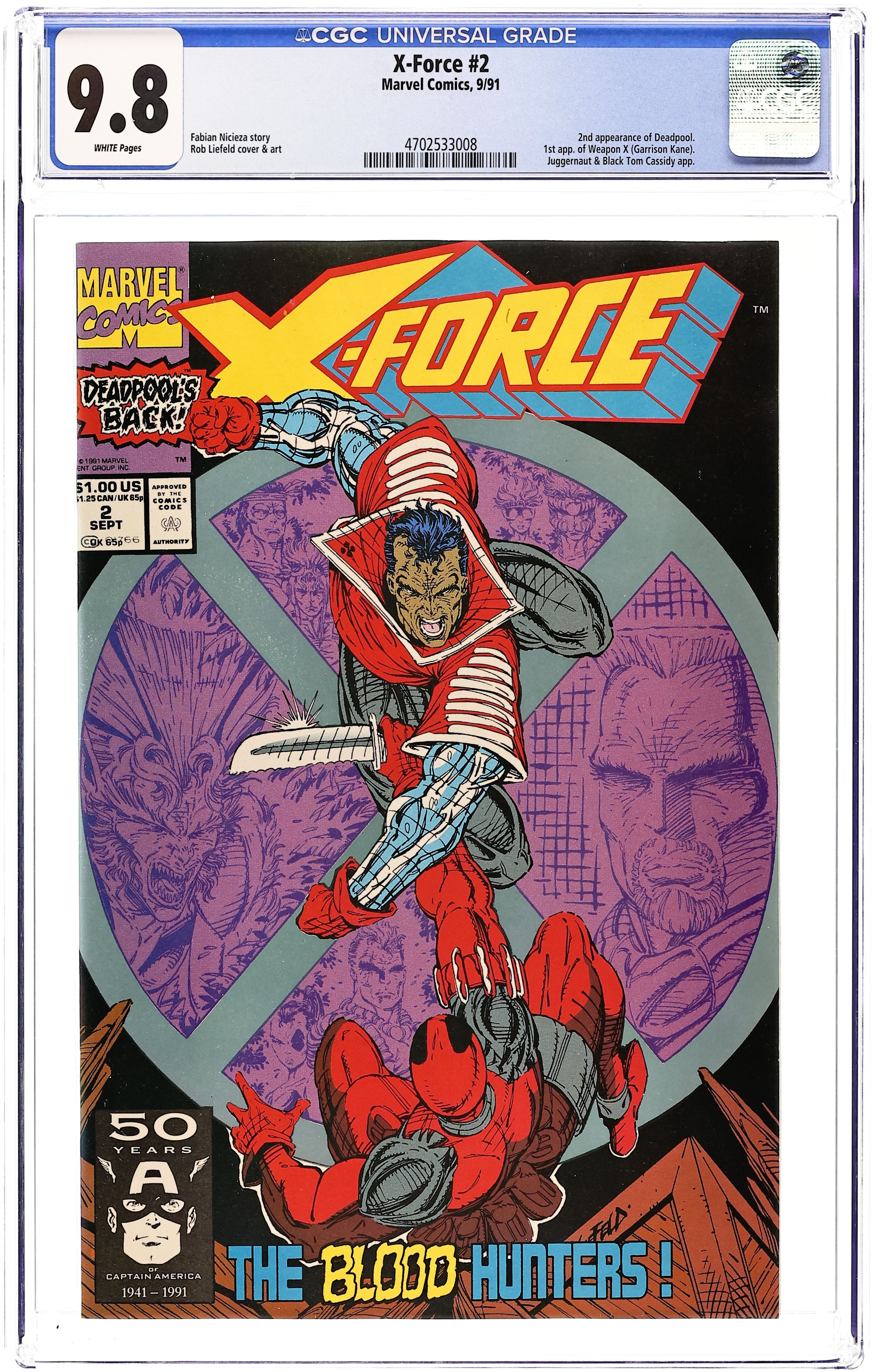 Direct Edition. Cover art by Rob Liefeld. The Blood Hunters, script by Rob Liefeld (plot) and Fabian Nicieza, art by Rob Liefeld; Kane fights Deadpool; During a training exercise, Feral guts Sam; Juggernaut is revived; appearance by Weapon X [2nd Deadpool; 1st Garrison Kane]. 36 pgs. $1.00. Cover price $1.00.
