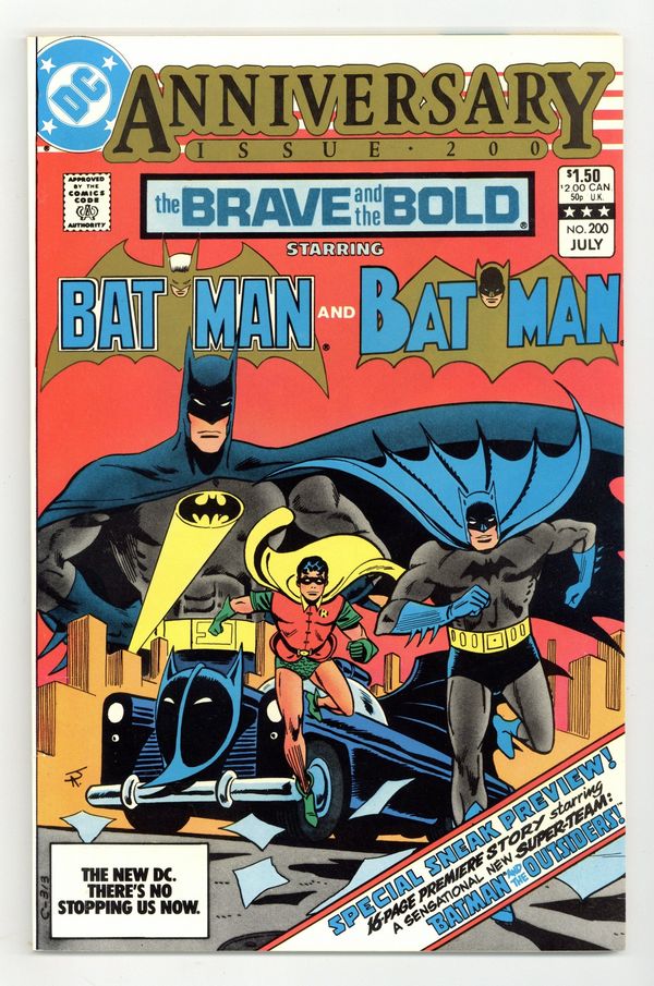 Starts Mar 16 Direct Edition. 64-page giant. Cover by Jim Aparo. Final issue of the series-1st Appearance of Katana, 1st appearance of Geo-Force, and 1st appearance of Halo. The Golden Age Batman stars in "Smell of Brimstone, Stench of Death!", script by Mike Barr, pencils by Dave Gibbons, inks by Dave Gibbons (1-3, 20-40) and Gary Martin (4-19); The story explains how 2 different personas for Brimstone exist: Both aware somehow of each others' existences on a spiritual level; In 1955, on Earth-2, Brimstone's defeated by Batman and sent to prison, but later transfers his 'spiritual' essence to his doppelganger on Earth-1 in 1983 to restart his criminal empire; He learns of a Batman on this world, but is also defeated here by him; When his essence returns to its own body, it is a vegetable by this time, trapping him there for the rest of his natural life, while his 'good' Earth-1 counterpart is unaware of what happened. The contemporary Batman stars in "Hell on Earth!", script by Barr, art by Gibbons. Back-up story: 1st appearance of Batman and the Outsiders in a 16-page sneak preview, script by Barr, art by Jim Aparo. One-page Bat-Mite strip by Stephen DeStefano. 68 Pages, Full Color. Cover price $1.50.