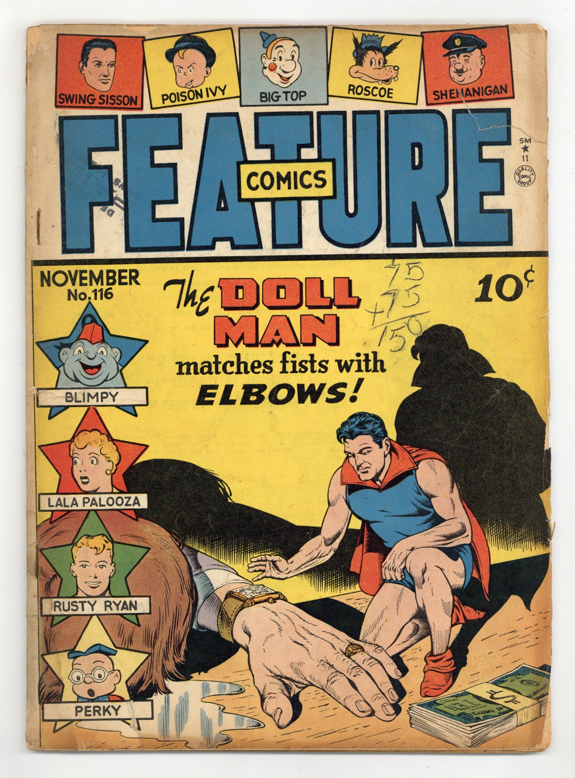 Cover art by Al Bryant. "Elbows," script by Bill Woolfolk; Doll Man (Darrel Dane) vs. Elbows Spadden. "The Joint Was Jumping With Weird Wonder"; Swing Sisson vs. Slip Mombone. "California: 999 Miles Thataway" starring Roscoe. "The Magic Ring," script and art by Al Stahl; Blimpy vs. Joe and his gang. "Alababa Clams Up" starring Rusty Ryan and Pierpont Lee, script and art by Paul Gustavson. "In Ugly Land" starring Perky and Queen Glamoura, script and art by Gill Fox. "Rescuing Kathy" starring Officer Shenanigan, art by Michael Senich. 52 pgs., full color. Cover price $0.10.