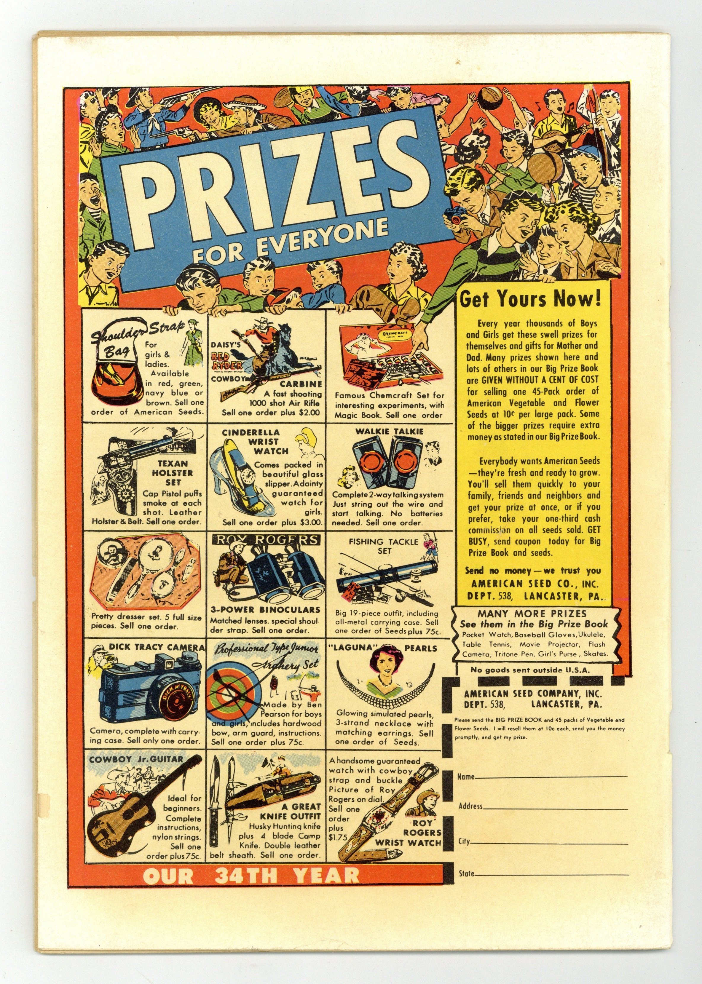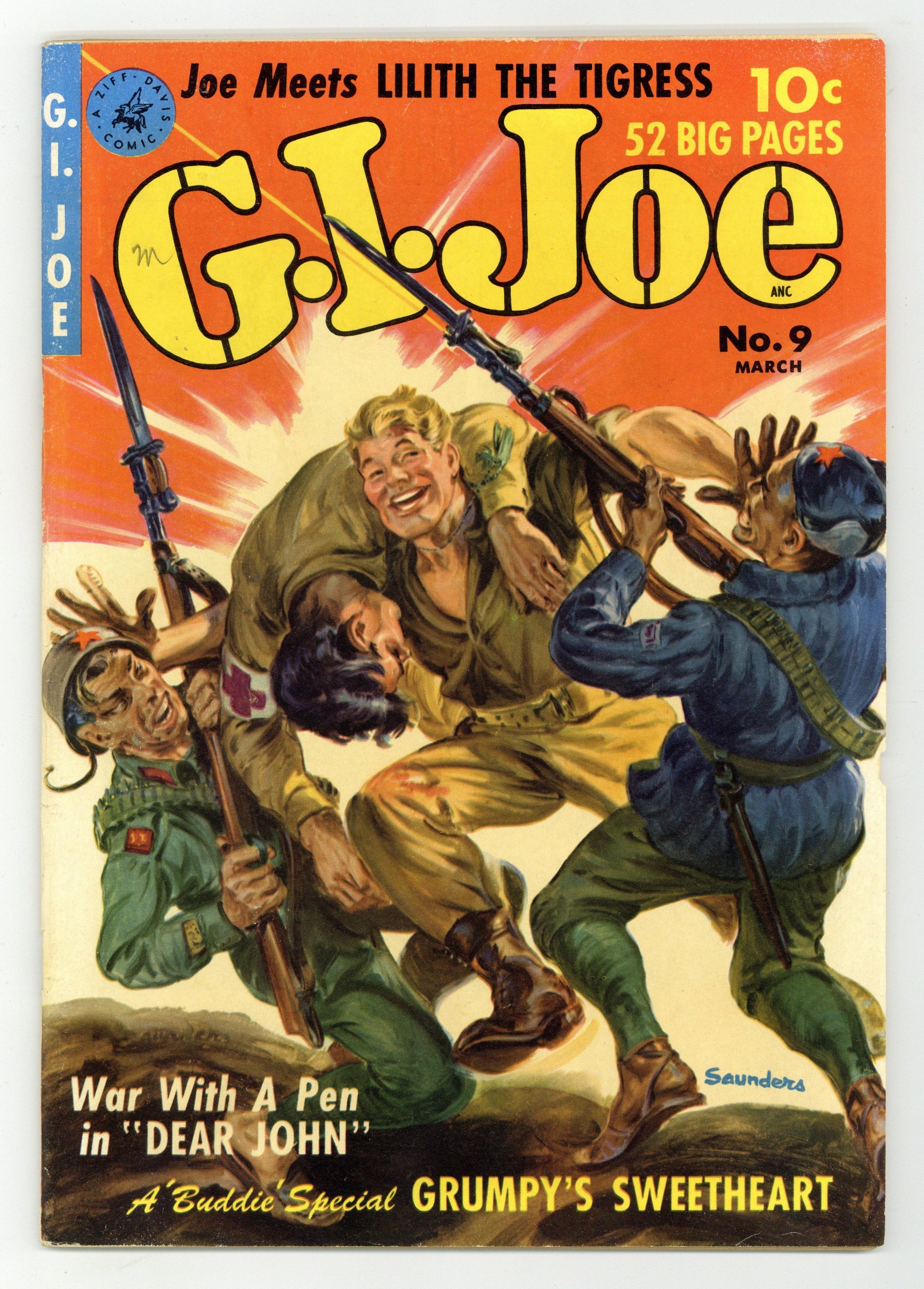 Painted cover by Norman Saunders. Stories and art by Dan De Carlo, Rudy Lapick, Jack Sparling, Paul S. Newman, Mort Lawrence, and Wally Littman. Neither a tie-in with the later toy line/cartoon nor a grim war comic, this first-gen GI Joe focused on lighthearted tales of military life. The Yardbirds, featuring Pvts. Windy and Whitey, was straight-up comedy of the Beetle Bailey/Sad Sack variety. A guy who never gets letters from home wonders if he's better off than the guy who gets a "Dear John" letter. Scantily clad USO stage magician Little Miss Magic lends a hat when the boys are captured by enemy soldiers during R&R. Joe reveals key information to beautiful enemy agent Lilith the Tigress, or so it seems. Plus the story of how draftees Windy and Whitey became the dimwittest privates in the Army, with art by future Archie legend Dan De Carlo. Quick Change; Dear John; G.I. Joe Meets Lilith the Tigress; Buddies: Grumpys Sweetheart; The General Who Led The Way; Little Miss Magic; Ancient Sam; The Yardbirds: Draft Bait!; The Baby of Company B. 48 pages, Full Color. Cover price $0.10.
