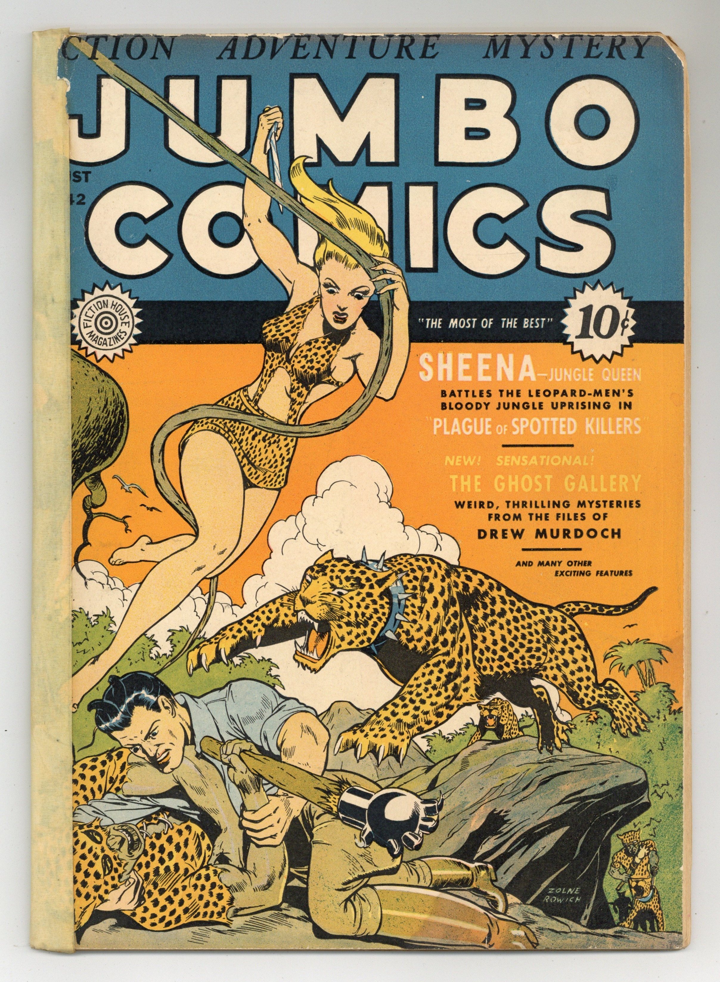 Cover by Dan Zolnerowich. Edited by Jerry Iger. Stories and art by Will Eisner, Jerry Iger, Lee Ames, Mort Leav, Alex Blum, Bob Hebberd, Rafael Astarita, and Robert Webb. An influential anthology starring jungle hero Sheena, featuring early art by legendary comics artists in the Eisner-Iger Shop. When Sheena discovers the Leopard Men are controlled by Nazi agents, she actually smashes a swastika over one of them; The debut of Ghost Gallery, featuring the adventures of ghost-hunter Drew Murdoch; Agent ZX-5 battles fifth columnists, Nazi spies operating within the U.S. The Hawk; Weird Stories of the Supernatural; Bobby; Sheena, Queen of the Jungle; Pee Wee; Ghost Gallery; Midnight the Black Stallion; Tom Dick and Harry; The Killer from Beyond; ZX-5 Spies In Action; Inspector Dayton. 64 pages, Full Color. Cover price $0.10.