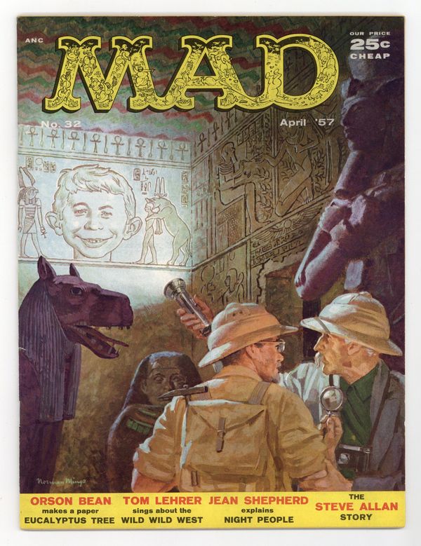 Painted cover art by Norman Mingo. "Nansy," art by Wallace Wood; A look at a joke from one cartoon strip as it might be interpreted by other strips. "The Steve Allan Story," art by Bob Clarke; Shows Steve at work and discusses how tv show is produced. "It's Gonna Be A Mad Mad Year!", script by G. Stang, art by Wallace Wood; Foolish predictions for world events in the coming year. "Big Big Story," script and art by Don Martin; After years of laboring in obscurity, reporter Joe finally finds a big story, only to be fired when he's three days late finding it. "Making A Paper Eucalyptus Tree," script by Orson Bean, art by Wally Wood; Orson delivers a monologue built around his paper trick, and instructions for making the tree. "The Ideal Woman," script by D. Purdy, art by Kelly Freas; The ideal woman as visualized by 6 magazines, compared to the women who read the magazines. "What's Happened To Sports Magazines?", art by Bob Clarke; Analysis of older style and modern sports magazines, with their differing viewpoints on the sports versus lifestyles of sports personalities. "Movies Are Longer Than Ever," art by Wallace Wood; Reviews of three very long movies: Giant, War And Peace, and The Ten Commandments. "Tom Lehrer Sings," art by George Woodbridge; A brief fake biography with an illustrated song, including sheet music. "Future TV Ad," art by Don Martin; Phony ad storyboard for Schveppes Activated Sparkling Seltzer. "The Night People vs. Creeping Meatballism," script by Jean Shepherd, art by Wally Wood. "The MAD Dating Technique," art by Bob Clarke. "MAD Record Labels," script by Albert B. Feldstein, art by Wally Wood; Phony record labels for 45s. 52 pgs., B&W. Cover price $0.25.