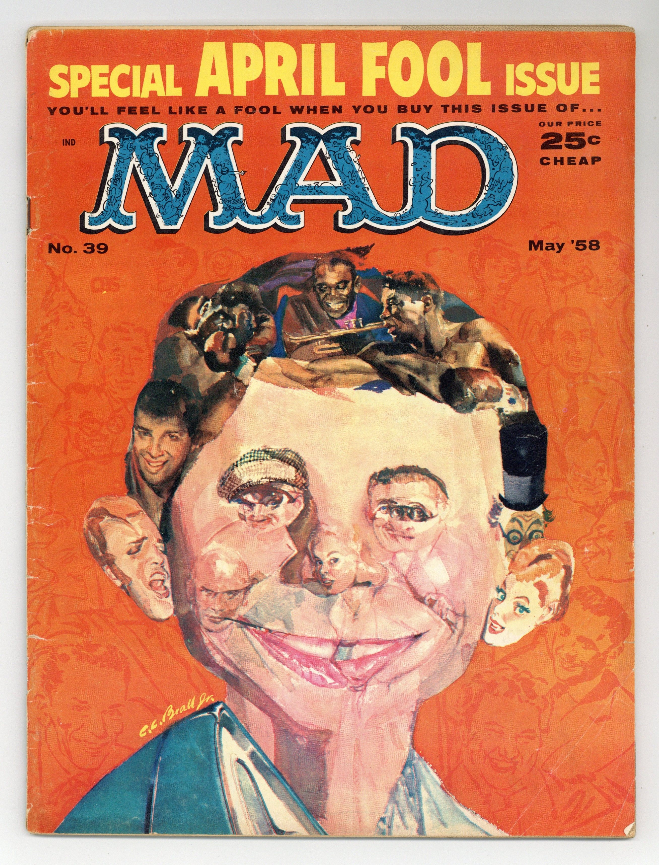 Painted cover art by C. C. Beall Jr. "Typewriters To Fit Your Trade," script by Frank Jacobs, art by Bob Clarke. "How To Make America's Kids...Science Conscious," art by Wally Wood; Ideas to incorporate science lessons into various media. "The Suburbs Are On Their Way Out!", script and art by Dave Berg; Discussion of the theory that the suburbs will keep moving so far out and get so crowded that eventually people will move back into the cities. "Woodman, Spare That Tree!", script by George Pope Morris, art by Don Martin. "TV Scenes We'd Like To See," script by E. Nelson Bridwell, art by Joe Orlando; Scenes from the following TV shows with unusual outcomes: You Asked For It, a Bob Hope special, and the Steve Allen Show. "Commemorative Stamps," script by Tom Koch, art by George Woodbridge; Phony U.S. postage stamps for people and events that would never be commemorated. "Big Big Earth," script by Bob Elliott and Ray Goulding, art by Mort Drucker; Several roving correspondents interview people across the country during their spring cleaning. "Accidental Inventions," script by Paul Krassner, art by Joe Orlando. "Party Games," script by Frank Jacobs, art by Wally Wood; Instructions for three impossible, illegal, and dangerous party games. "Why I Changed My Job," script by Frank Jacobs (as Dexter Yinckley), art by George Woodbridge; An accountant's story of the road to failure as he changes jobs and takes the fall for the boss's embezzling. "MAD Dogs And Their Owners," script by Frank Jacobs, art by Kelly Freas; Another take on the age-old idea that people and their dogs look alike. The "Saturday Evening Pest," script by Tom Koch, art by Bob Clarke; Satire of the magazine The Saturday Evening Post. MAD T-Shirts ad. 52 pgs., B&W. Cover price $0.25.