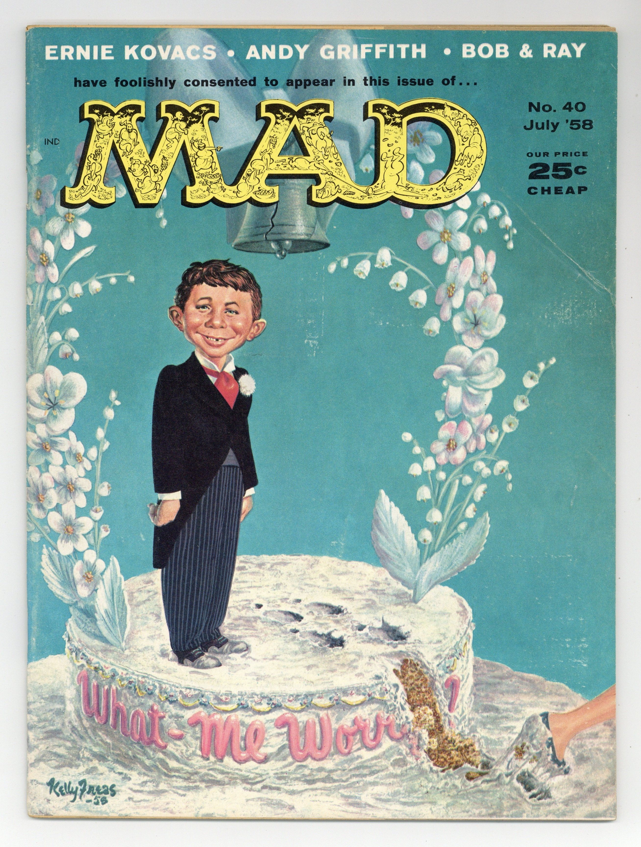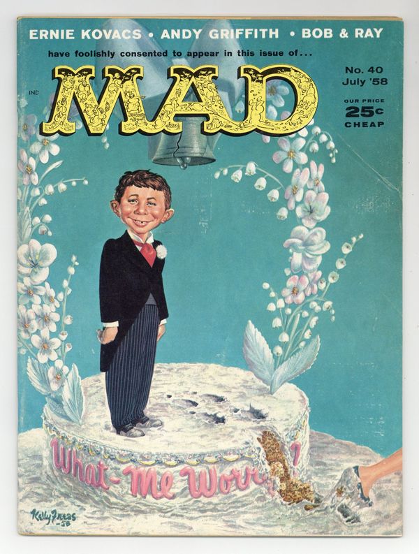 Painted cover art by Kelly Freas. "Initials That Describe The Name," script by Frank Jacobs, art by George Woodbridge; A look at the future overuse of acronyms. MAD Jewelry ad. "Pizza Pie," script and art by Dave Berg; All the problems associated with pizzas, the new national dish. "The Paper-Pickers," script and art by Don Martin; The fate of a park maintenance person who shows off his skills at picking up litter. "Ecccchhh, Teen-Age Son of Thing," art by Wally Wood; The Doctor hypnotizes an average teenager to become an Elvis Presley clone. "TV Scenes We'd Like To See," script by E. Nelson Bridwell, art by Joe Orlando; Scenes from the following TV shows with unusual outcomes: People Are Funny; The Loretta Young Show; I've Got A Secret; Anacin commercial; Mickey Mouse Club; The Lone Ranger; The Lineup. "Inside Story," art by Basil Wolverton; Stomach shapes of celebrities, based on their lives. "Pravda," script by Frank Jacobs, art by Wally Wood; Parody of the Soviet Union's Pravda newspaper. "The Cold Cereal War," script by Bob Elliott and Ray Goulding, art by Mort Drucker; A look at applying military strategy to creating cereal premiums. "The Bear Hunter," script and art by Don Martin; A man uses every weapon he has while being chased by a bear. "Future Of-The-Month Clubs," script by Frank Jacobs, art by Bob Clarke; A look at some possible future clubs inspired by Book-Of-The-Month type clubs. "Coast-To-Coast For $16.75," script by Frank Jacobs, art by Wally Wood; An account of a cross-country trip booked by MAD using unconventional conveyances. "What It Was, Was Football," script by Andy Griffith, art by George Woodbridge; An illustrated version of the comedy routine. Parody of Salem Cigarettes ad, art by Kelly Freas. 52 pgs., B&W. Cover price $0.25.