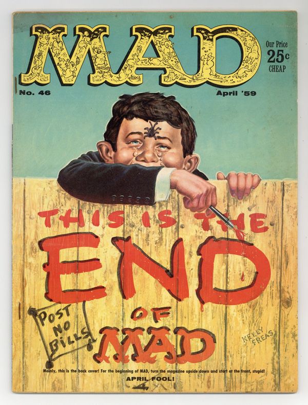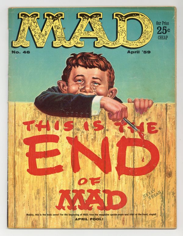 Cover art by Kelly Freas. Parody of ad for RCA Victor color televisions, art by Kelly Freas. "Sunday Evening Television Roulette," script by Gary Belkin, art by Mort Drucker; The interesting TV viewing you could have by constantly switching channels between ABC, NBC, and CBS. "The Suicide," script and art by Don Martin. "Authentic Sounds In Stereo," script by Tom Koch, art by Wally Wood; Ridiculous extremes to the trend for "real sounds" on stereo records. "How High-Class Magazines Can Use Low-Class Pictures," script by Frank Jacobs, art by Joe Orlando; Shows how the same photo can be used by many different publications, through cropping. "Western Weapons Of The Future," script by Larry Siegel, art by George Woodbridge; Various things TV western heroes might use as weapons, if the trend away from guns continues. "The Hidden Persuaders Become The Hip Persuaders," script by Gary Belkin, art by Wally Wood; Parodies of ads, using hip language and celebrities. "How To Choose And Train Your Master," script by Frank Jacobs and Robert Margroff, art by George Woodbridge; Excerpts from a book written by a dog, on what to look for and how to train a master. "MAD's Modern Handy Phrase Book For The American Tourist," script by Sy Reit, art by George Woodbridge. "If Famous Authors Wrote The Comics," script by Frank Jacobs, art by Wally Wood; Various comic strips written in the styles of: Paddy Chayefsky; Gilbert & Sullivan; Rudyard Kipling; Walt Whitman; Rogers & Hammerstein; Tennessee Williams; Edgar Allan Poe; Mickey Spillane. "MAD's Cut-Rate Success Symbols," script by Sy Reit, art by Joe Orlando. "Movies Are Emptier Than Ever," script and art by Dave Berg; Showing how theaters can attract more patrons by remodeling to be more like watching TV at home. "The Happy Endings Weren't So Happy," script by Sy Reit, art by Bob Clarke; Thoughts on what happened after the end of several fairy tales. 52 pgs., B&W. Cover price $0.25.