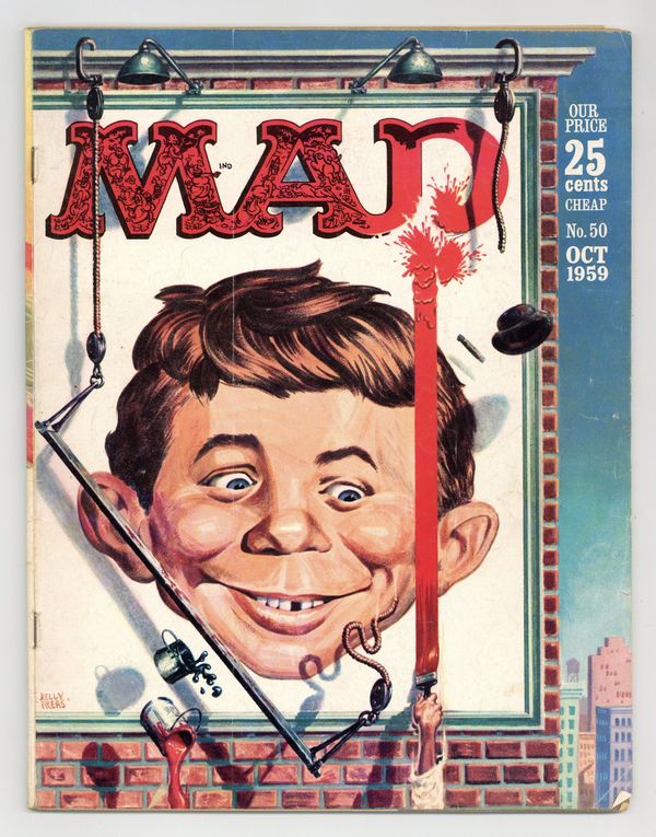 $12.00Cover art by Kelly Freas. Parody of ad for Parliament cigarettes. "Spot That Plug!", script by Sy Reit, art by Wallace Wood; Analyzes how television show scripts have subtle product plugs and predicts that in the future we will see shows consisting of nothing but a recitation of brand names. "NBC Plays CBS In The TV Baseball League," script by Arnie Kogen, art by Mort Drucker; A wacky look at a baseball game played by television stars playing in character. "The Nearsighted Man And The Telephone," script and art by Don Martin; A man mistakes another man for a pay phone, and another man retrieves the dime from the "phone" man's mouth. "Where Song-Writers Get Their Inspiration," script by Frank Jacobs, art by George Woodbridge; Everyday inspirations that may have occurred for famous songs, from advertisements, news articles, letters, etc. "Women In Whisky Ads," script by Al Jaffee, art by Bob Clarke. "MAD Playgrounds That Prepare Kids For Adult Life," script and art by Dave Berg; Dave explores ideas for playgrounds that will make kids just as miserable as they will become as adults. "Changing Meanings For Fun & Profit," script by Larry Siegel, art by George Woodbridge; A look at how people in various businesses could use the Hollywood and Broadway practice of excerpting from bad reviews to create more favorable reviews. "What Our Teenagers Really Think About," script by Dave Berg, art by Bob Clarke; It really is true that all teenagers think about is the opposite sex. "Blue Confessions," script by Paul Laikin, art by Wallace Wood; Parody of True Confessions type of magazine, showing how the stories are not as spectacular as the misleading headlines. "The Night Peter Gone Cracked," script by Larry Siegel, art by Bob Clarke; Parody of Peter Gunn TV show, showing how the character would react if not his usual cool, suave self. "The Big House Beacon," script by Larry Siegel, art by Joe Orlando; What if a prison published a high-school yearbook type of publication?; A look at the class of '59. Parody of General Motors Body By Fisher ads, art by Kelly Freas. 52 pgs., B&W. Cover price $0.25.