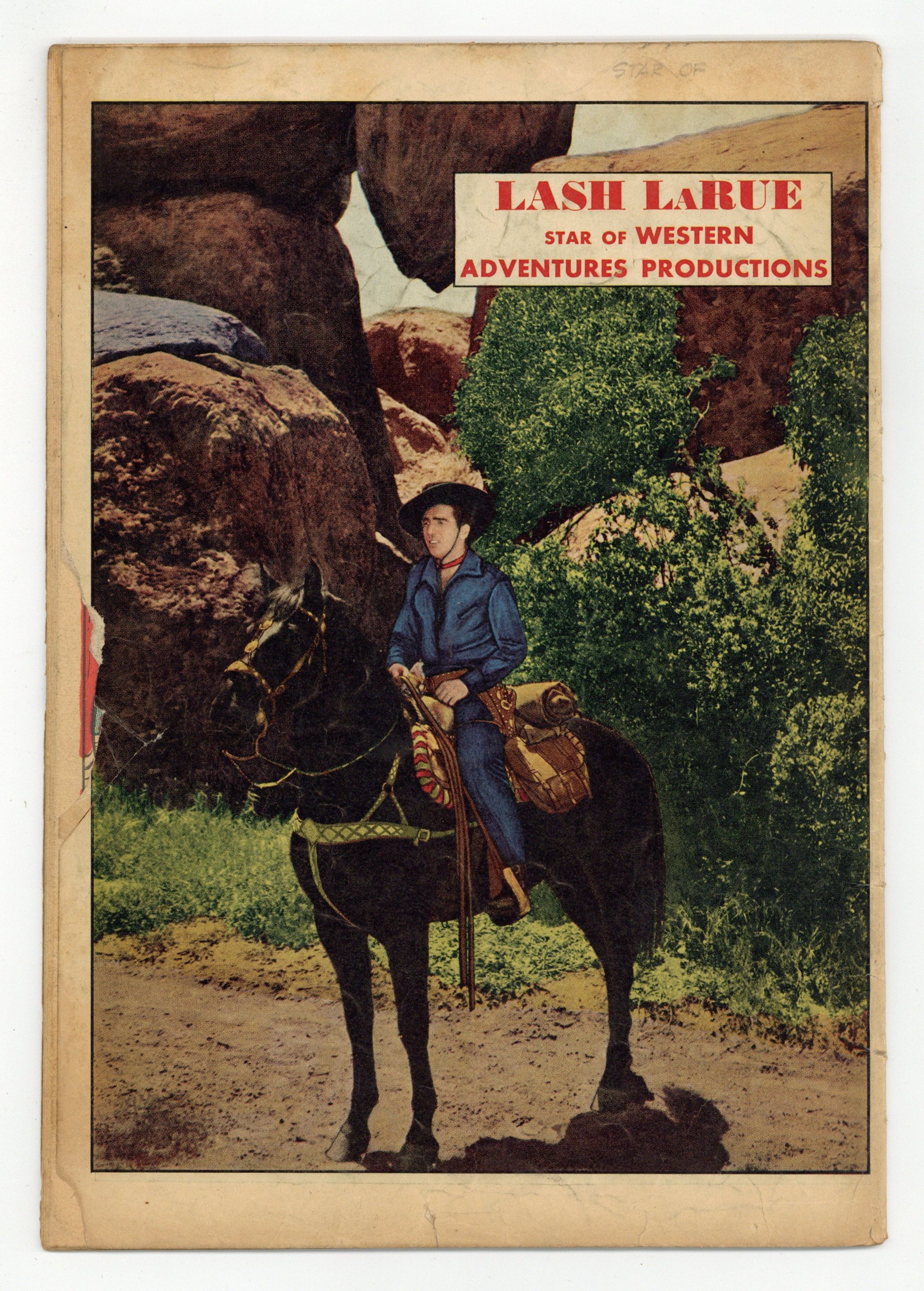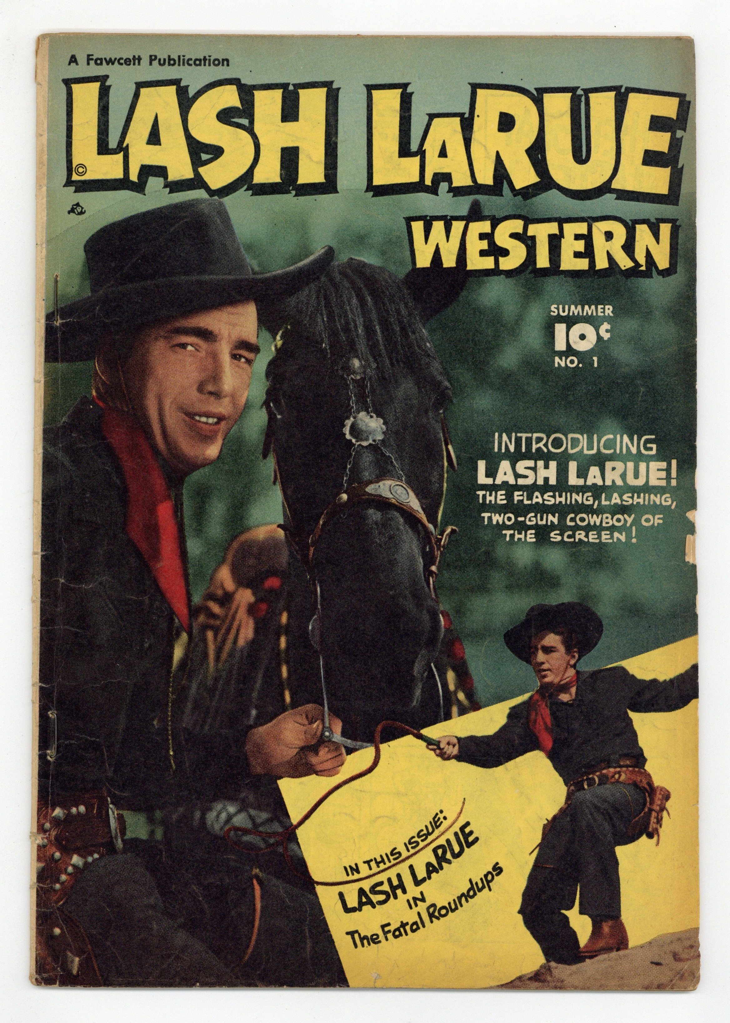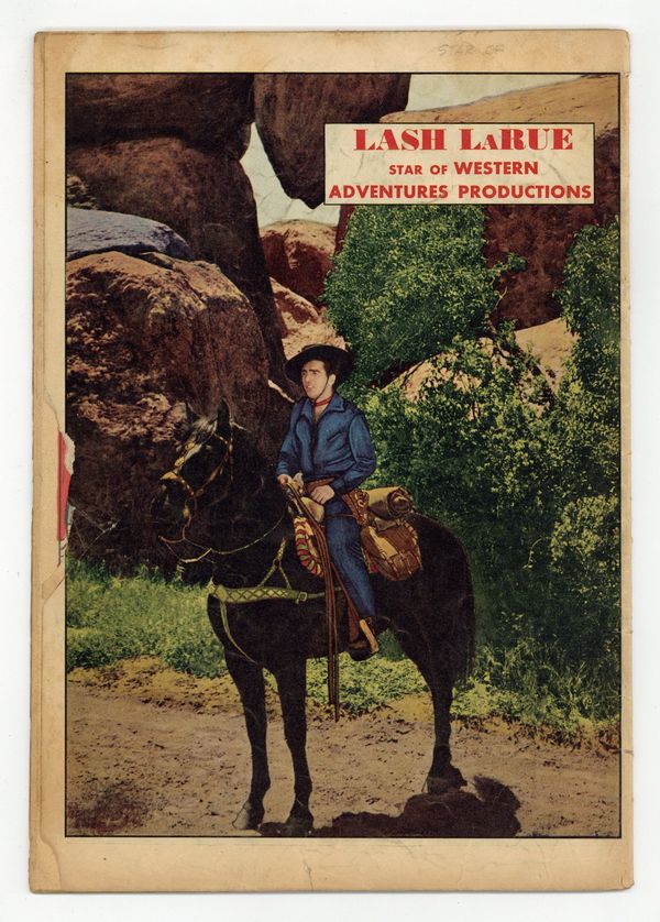 Movie cowboy Lash Larue is known for his trademark black outfit and his skill with a bullwhip. "Roving marshal" Lash investigates a protection racket targeting ranchers in Imperial Valley, and traces it back to the seemingly law-abiding owner of the local feed store. In Peaceful Corners, Lash tracks Red Frisby and his cattle-rustling outlaw gang. Lash has to keep Bill Lamont Jr. alive until he turns 21 and inherits his father's ranch, but ranch foreman Sledge has other ideas, in a story with nice art by an unknown artist. These stories are so early, Lash doesn't even have his trademark black getup yet. Plus "Comix Cards" (like the later Marvel Value Stamps) featuring Lash Larue. Chief Gray Matter; The Range Riders of Destruction!; Wagonwheels Will Never Get Over It; The Fatal Roundups; Loco Lew; Kidder Kidd; Big Bow and Little Arrow: The Big Snooze; The Planned Accidents! 32 pages, Full Color. Cover price $0.10.