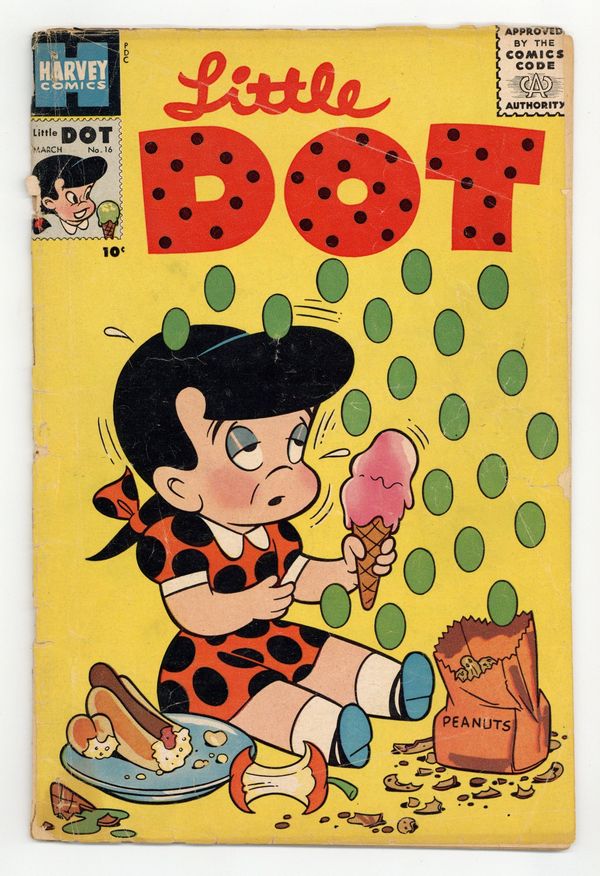 Stories and art by Steve Muffatti and others. Cover by Warren Kremer. One of the mainstays of Harvey's long-running kids' comics, Little Dot also features Richie Rich and Little Lotta. Little Dot learns to create dotted lines with her pogo stick so her friends can always find her house. Richie Rich's ill-mannered pal Clarence gets a new perspective after a boy saves his life. Richie manages to bring Dot and the entire gang to the drive-in movie for two bits, thanks to Daddy Rich's stretch limo. Little Dot; Richie Rich: Some Voyage; Little Lotta; Richie Rich; Little Lotta. 32 pages, Full Color. Cover price $0.10.