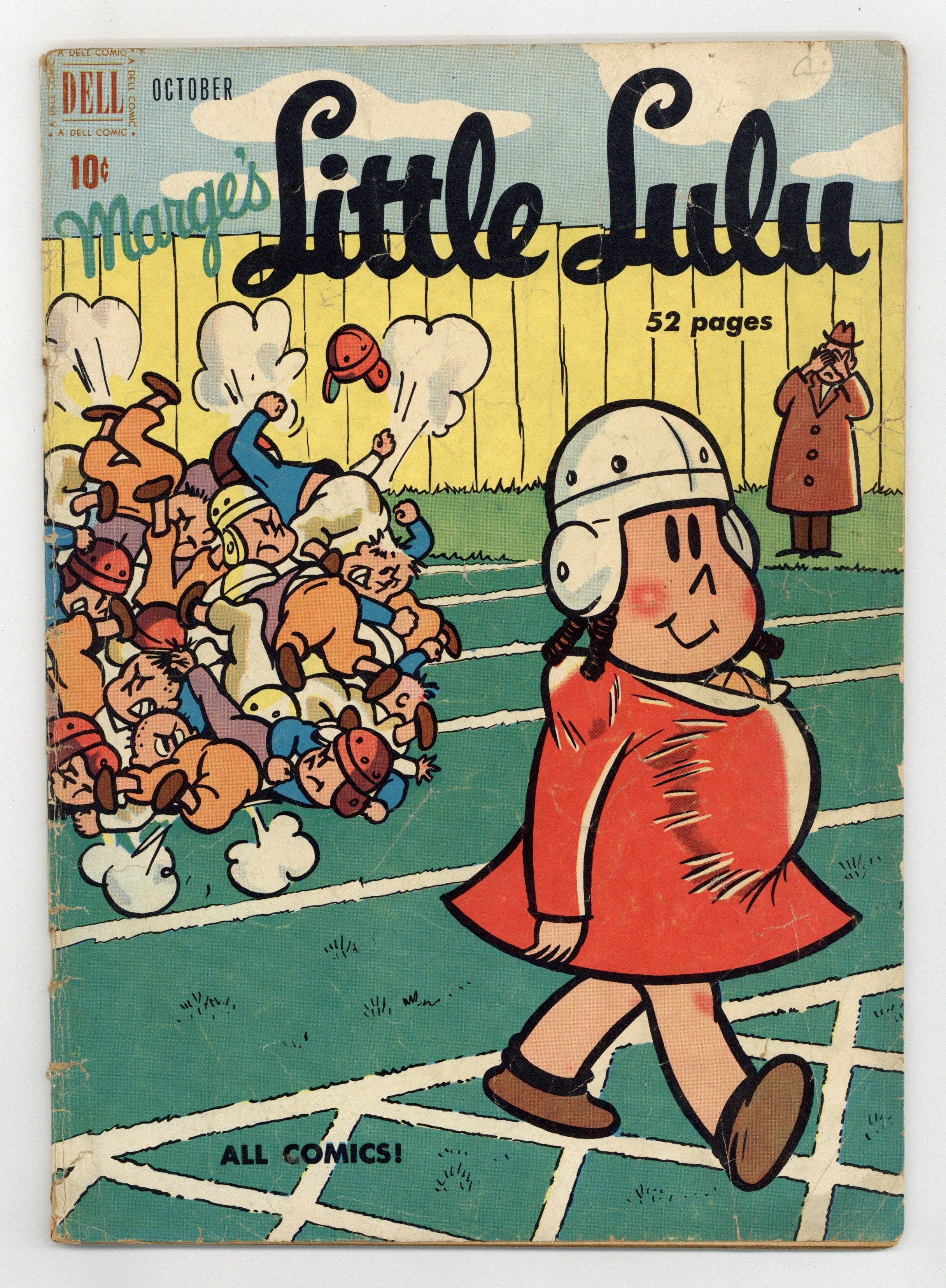 Published Oct 1950 by Dell/Gold Key.$33.00Cover art by Irving Tripp. Untitled Little Lulu story; Lulu disguises herself as a boy to try to keep the boys from playing hooky. Untitled Little Lulu story; Lulu's pop pays Lulu to try to get Alvin to break his noisy record. Gazo the Hypnotist; Lulu thinks she has hypnotized Tubby into giving her an ice cream cone. Shirley the Shadow; Lulu tells Alvin about the little girl who lost her shadow. Untitled Tubby story; Tubby's model airplane flies out the window and into a counterfeiters' apartment. The Hat; Lulu wears her mother's new hat outside and Wilbur's dog eats it. All scripts by John Stanley, art by Irving Tripp. Two-page text story, Lulus Diry ("Diary"). Back cover has advertisement for five color Little Lulu pinups. 52 pages, full color. Cover price $0.10.