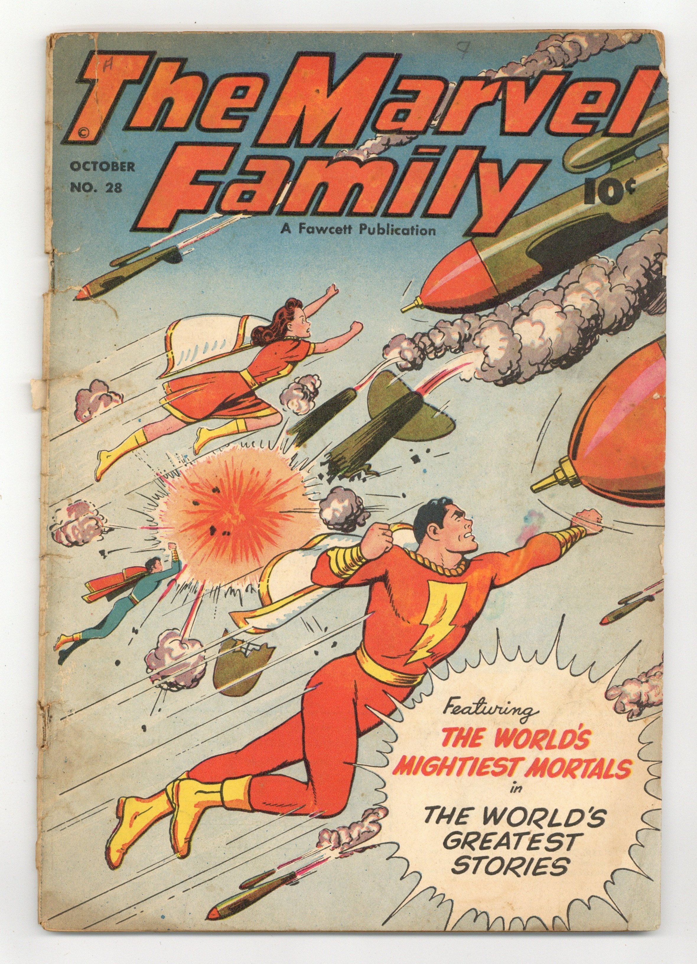 Stories and art by Otto Binder, Jack Binder, Kurt Schaffenberger, Bill Woolfolk, and Howard Boughner. Fawcett's most popular heroes, the original Captain Marvel (Shazam) and family, in solo and shared adventures. Sivana sees the movie "Gaslight" and decides to drive the original Captain Marvel crazy, before the word "gaslighting" was even a thing. Mary Marvel must stop a war between the Cat People of Vesta and the Dog People of Juno, in a truly adorable story (the cats use "flea guns" against the dogs....), so she enlists the help of Marvel Bunny. Captain Marvel, Jr. agrees to be the counterweight in a county fair ox-pulling contest, in a story that may feature early art by future Mad "Lighter Side" artist Dave Berg. Plus a plethora of vintage comics-format ads, including a hair-cream ad featuring detective Sam Spade, and a Tootsie Roll ad, Captain Tootsie Traps Killer Bear with Invisible Light, with art by Shazam co-creator CC Beck. Captain Marvels Dilemma; Boxcar Benny; Lazy Lee; Peewee Pete; Hopeful Harry; Tough Assignment; Captain Marvel Jr.: The Great Ox Pull; Mary Marvel: The Asteroid Adventure; No Mistake; The Marvel Family Puzzle Page; Cub Reporter; Captain Marvel: Vulcans Visitation. 48 pages, Full Color. Cover price $0.10.