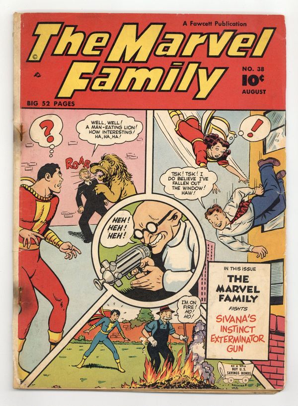 Cover by C. C. Beck. Stories and art by Otto Binder, C. C. Beck, Kurt Schaffenberger and Howard Boughner. Fawcett's most popular heroes, the original Captain Marvel (Shazam) and family, in solo and shared adventures. Sivana's latest invention eliminates everyone's instinctual responses, and The Marvel Family must prevent a plague of accidental suicides. Crooks fleeing Mary Marvel seek refuge in a Moreau-like compound of genetically altered animals. When a bodybuilder goes mad with his own power, Captain Marvel, Jr. must prevent this Charles Atlas ad-gone-wrong from destroying the city. Plus a plethora of vintage comics-format ads, including a hair-cream ad featuring detective Sam Spade, and a Tootsie Roll ad, Captain Tootsie to the Rescue, with art by Shazam co-creator CC Beck. The Extinct Instincts; Capt. Marvel Jr.: The Mad Muscle Man; Lazy Lee; Boxcar Benny; Headline Harry: Music Time; The Marvel Family Puzzle Page; Mary Marvel: The Science Wonderland; The Tornado; Captain Marvel Battles the Tycoon of Darkness. 32 pages, Full Color. Cover price $0.10.