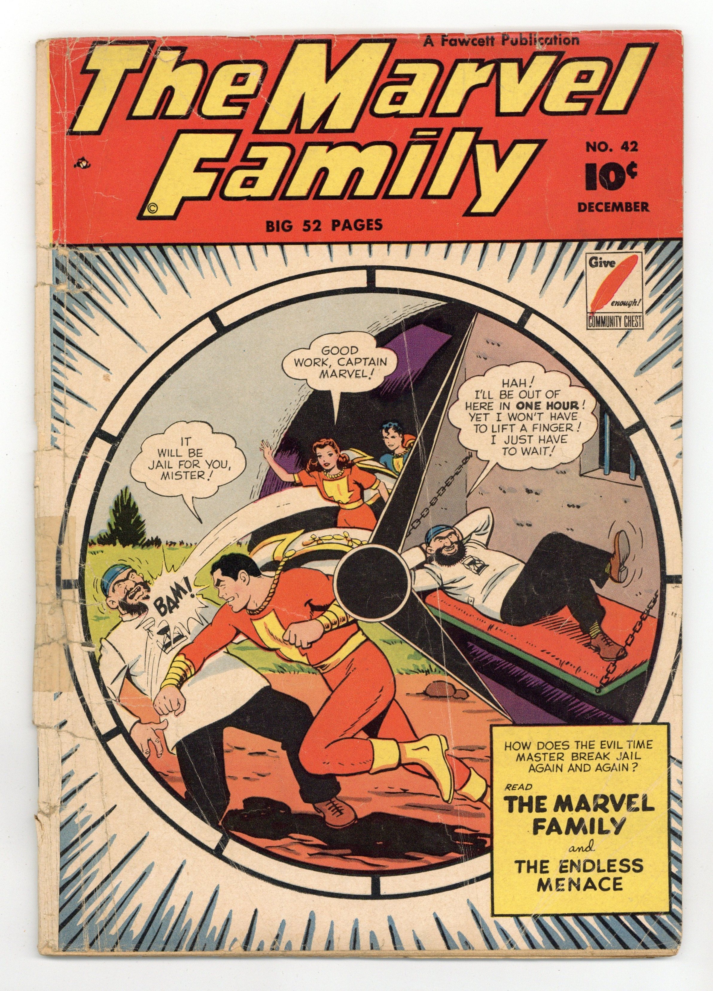 Stories and art by Otto Binder, C. C. Beck, Kurt Schaffenberger, and Howard Boughner. Fawcett's most popular heroes, the original Captain Marvel (Shazam) and family, in solo and shared adventures. The Time Master's new invention allows him to "Groundhog Day" the world, and he plans to use it to create the Perfect Crime. Jack Frost gets bored with only making the colors change on autumn leaves, so he decides to change all sorts of colors during summer, unless Mary Marvel can convince him otherwise. Captured by gangsters and gagged, Billy Batson manages to Scherezade his captors by writing them a Captain Marvel story that takes their attention until he can escape. Plus a plethora of vintage comics-format ads, including a hair-cream ad featuring detective Sam Spade. The Endless Menace; Capt. Marvel Jr.: The Enchanted Roc; Mary Marvel: The Runaway Colors; Journey for Jerry; Boxcar Benny; Lazy Lee; Dopey Danny Dee; Headline Harry: Western Woes; Captain Marvel Rescues Billy Batson; The Marvel Family Puzzle Page; Tightwad Tad. 48 pages, Full Color. Cover price $0.10.
