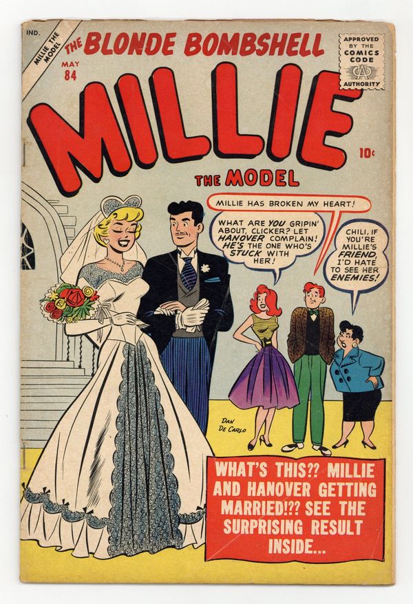 Cover art by Dan De Carlo. Untitled stories featuring Millie the Model and My Girl Pearl. Millie's Fashion Page. Several pages of Millie Models. Chili the Dilly activity page. When Millie Was in Her Teens! starring Millie the Model. Stories by Stan Lee, art by Dan De Carlo. Little Brother text story. 36 pgs. $0.10. Cover price $0.10.