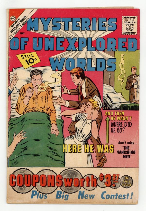 Cover by Steve Ditko. Stories and art by Steve Ditko, Rocco "Rocke" Mastroserio, Vince Alascia and Bill Molno. Charlton's popular series features tales of science fiction and fantasy with twist endings. A cave explorer vanishes after his latest expedition, in a story with art by Spider-Man co-creator Steve Ditko. The alluring Missa is so good at selling products on TV commercials, she's almost otherworldly. Oceanographer Emil's miniaturizing solution creates tiny oceans filled with tiny sea creatures, but.... A Small Ocean; She's Weird; Even a Martian Must Eat; The Earth Conquerors; The Vanishing Men. 32 pages, Full Color. Cover price $0.10.