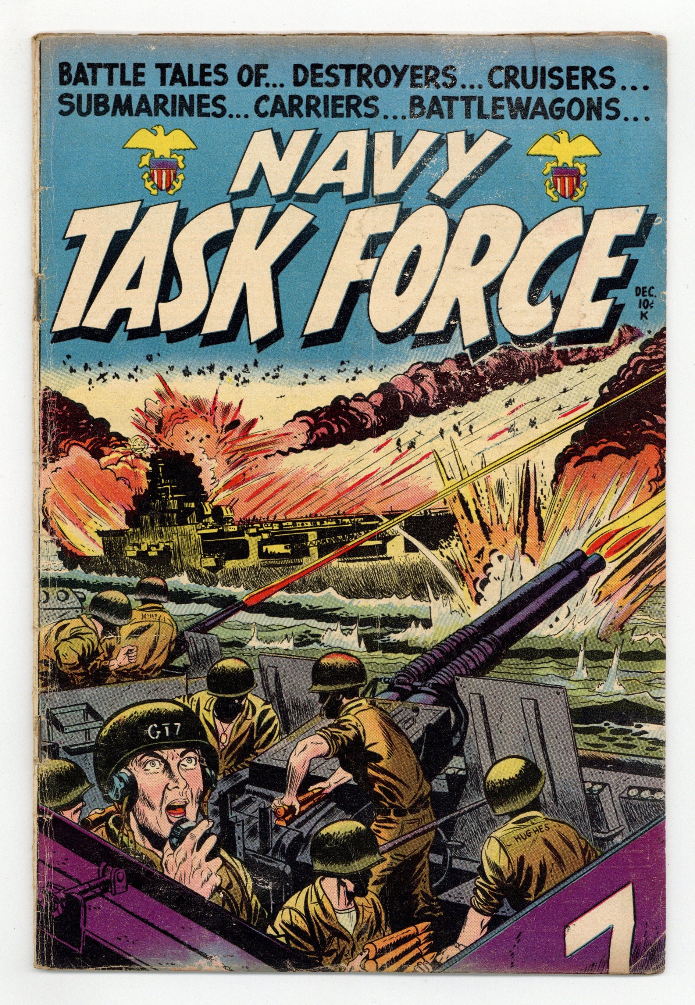 Cover by Eugene Hughes. Stories and art by Eugene E. Hughes and others. Naval battles and conflict at sea from publisher Stanley Morse. A Red Cross medic stays busy on the battlefield in Korea. Military engineers must rebuild a key bridge under fire during World War II. A US sergeant and captain must make difficult decisions involving their troops in combat. A Fighting Man; Regular Navy; Flat Top; The Fingers of Fate; Kamikaze! 32 pages, Full Color. Cover price $0.10.
