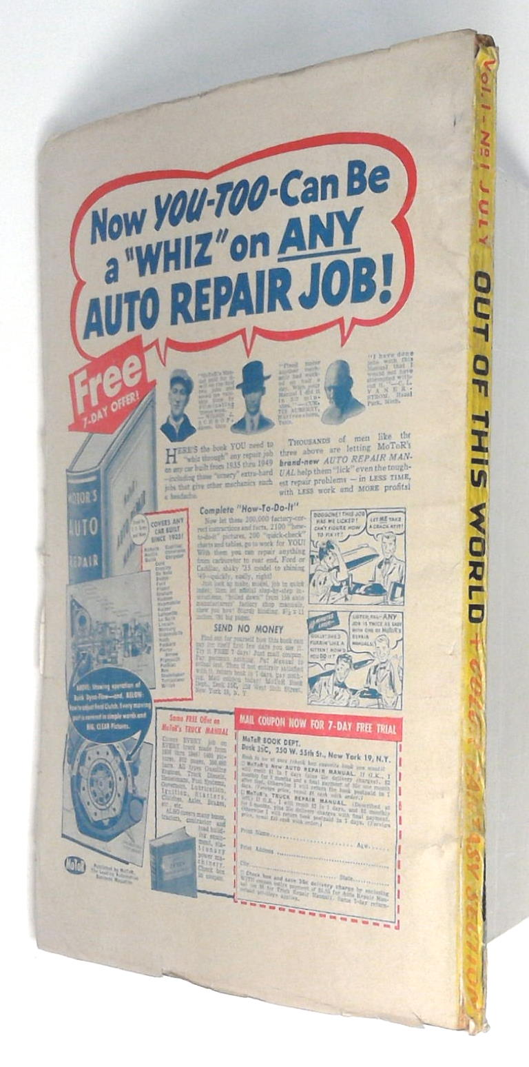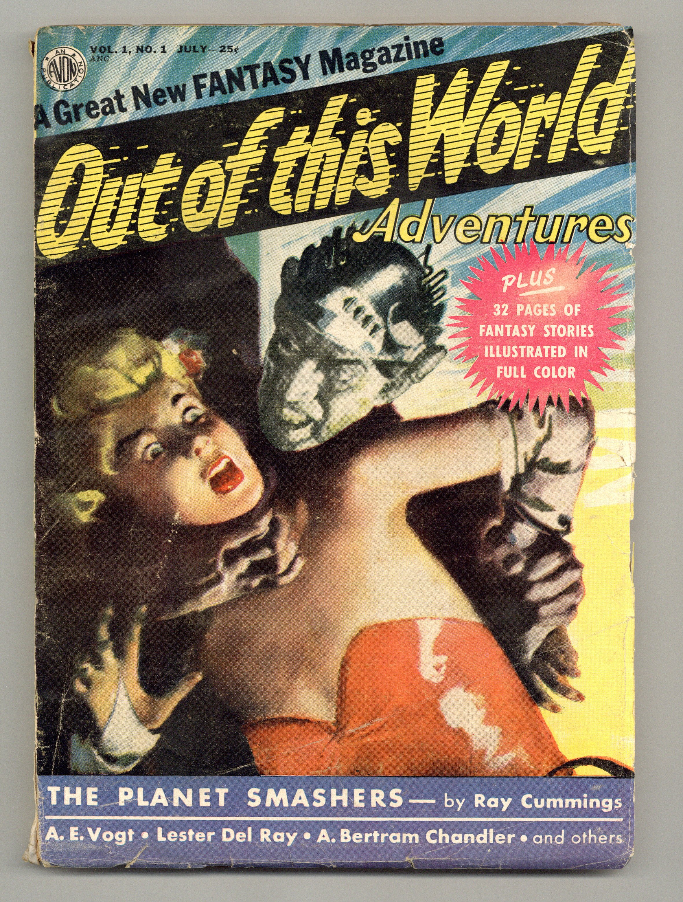 Volume 1, Issue 1 - July, 1950. 32 page illustrated color section contains reprints from Avon's comic book titles "Out of This World" & "Strange Worlds" with art by Joe Kubert and John Giunta. Science Fiction stories "The Planet-Smashers" by Ray Cummings, "Letter from the Stars" by A.E. Van Vogt, "Omega and the Wolf-Girl" by Lester del Ray, "The Puzzle of Priipiirii" by William Tenn, "The Shipwrecked Bogey Man" by Lloyd Williams, "Terror of the Mist-Maidens" by A. Bertram Chandler, "The Discord Makers" by Mack Reynolds, and "Forbidden Fruit" by Kris Neville. Illustrations by Martin and William F. McWilliam. 7" x 9 3/4"; black and white/color; 132 newsprint pages. Cover price $0.25.